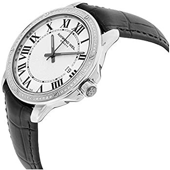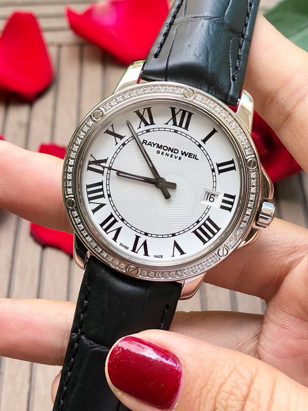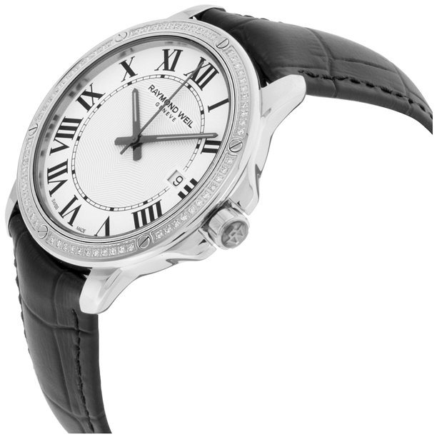 5591-LS1-00300 שעון יד ריימונד וויל שוויץ לגברים | דגם אלגנטי ברצועת עור שחורה | באזל משובץ יהלומים | לוח לבן רומי כולל תאריך | Raymond Weil Tango Diamond Bezel Black Leather Swiss Watch 5591-LS1-0030