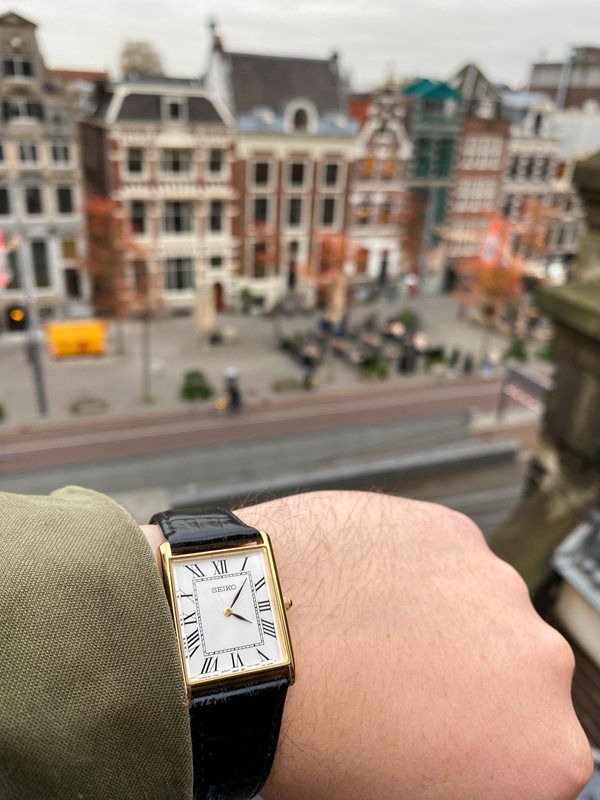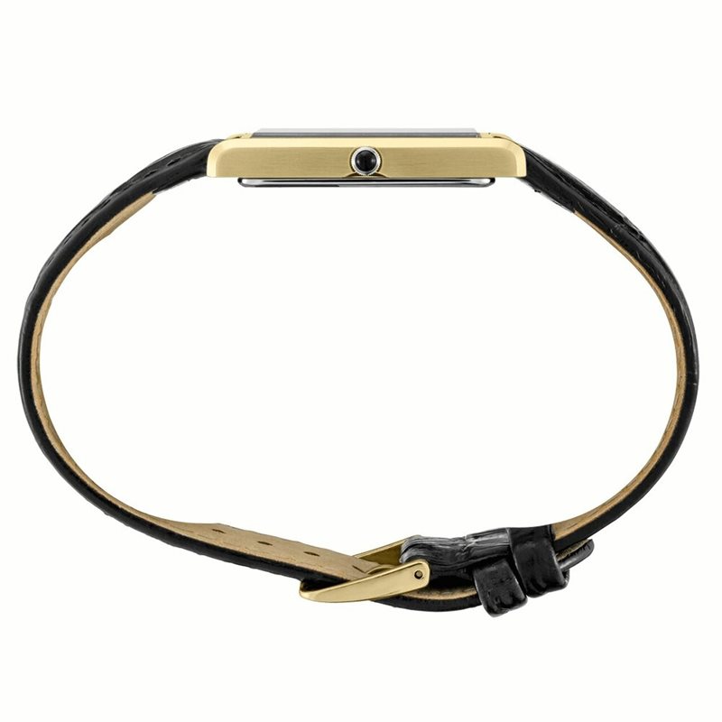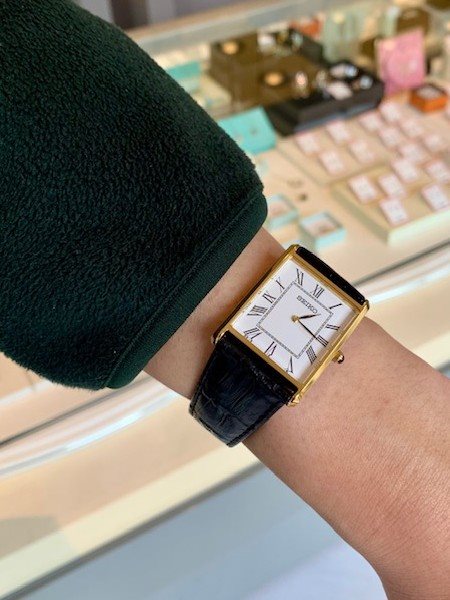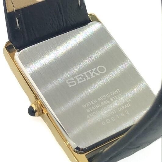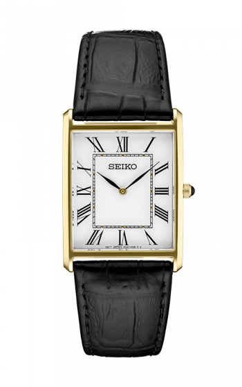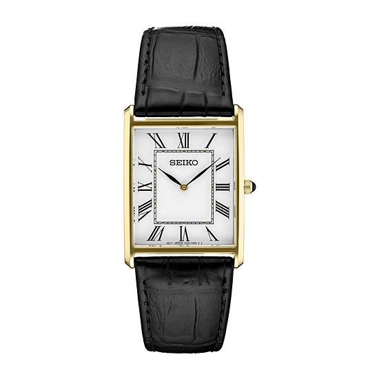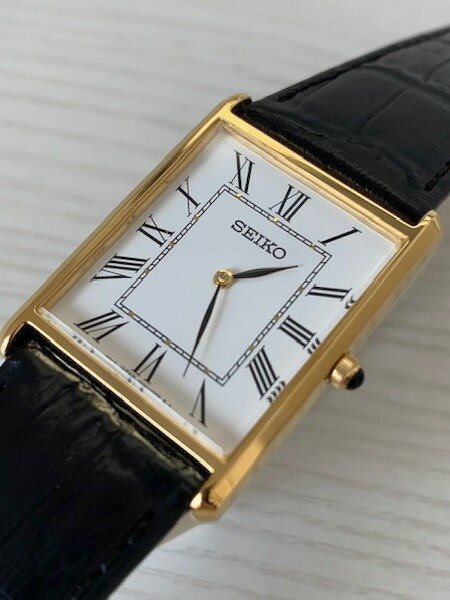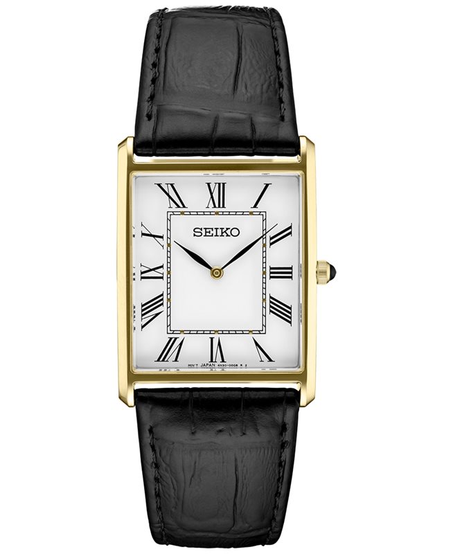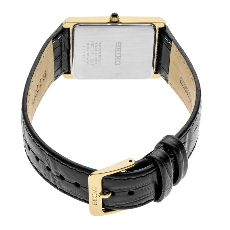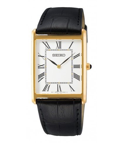 SWR052 שעון יד סייקו זהב מלבן | דגם יוניסקס קלאסי אלגנטי ברצוועת עור לוח לבן ספרות רומיות | מלאי מוגבל | שנתיים אחריות | Seiko Quartz White Dial Black Leather Watch SWR052
