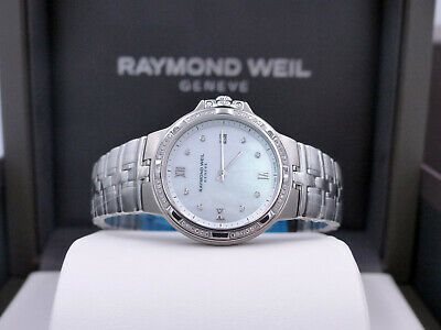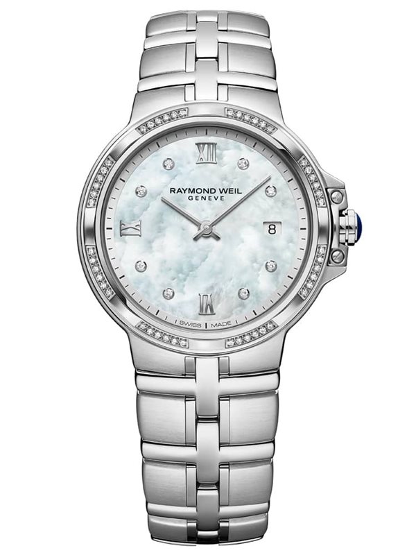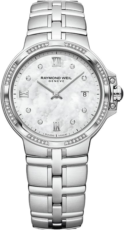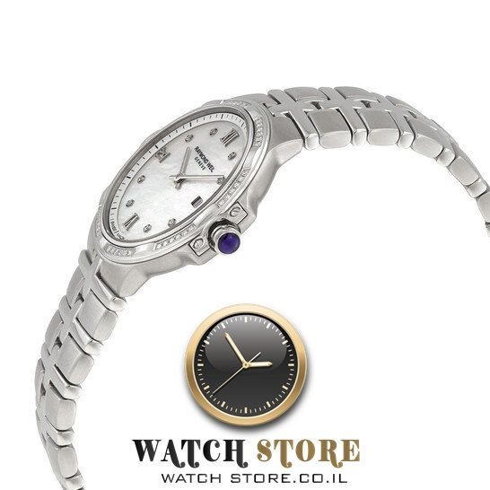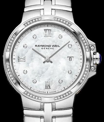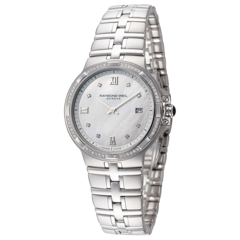 5180-STS-00995 שעון יוקרה של ריימונד וויל לנשים במבצע מדהים | לוח פנינה ובאזל משובצים ב 48 יהלומים | מלאי מוגבל כולל שנתיים אחריות | raymond weil parsifal diamond white mother of pearl dial ladies