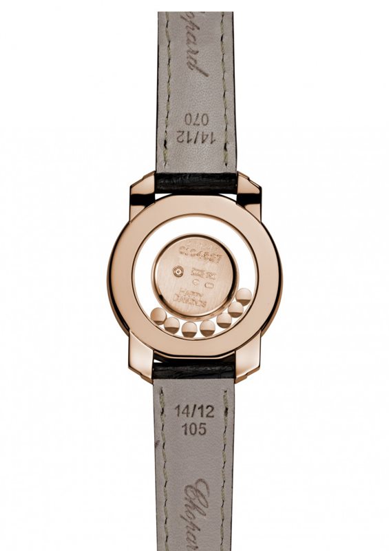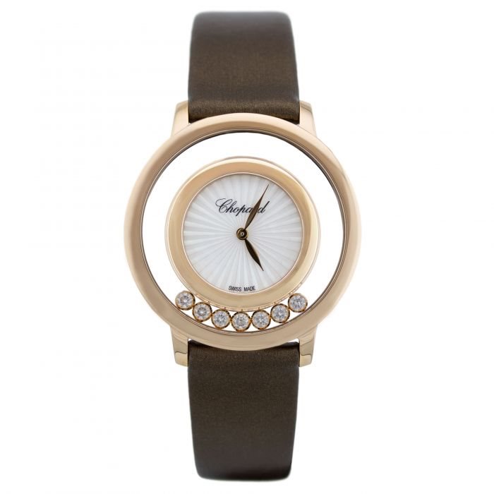 209429-5001 שעון יד יוקרתי של שופארד מסדרת הפיי | שעון זהב רוז 18K בלוח שקוף כולל 7 יהלומים מסתובבים בלוח | רצועת עור מיוחדת | שנתיים אחריות | שעוני יוקרה בראשון לציון | Happy Diamonds Icons Quartz