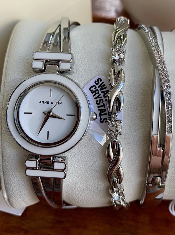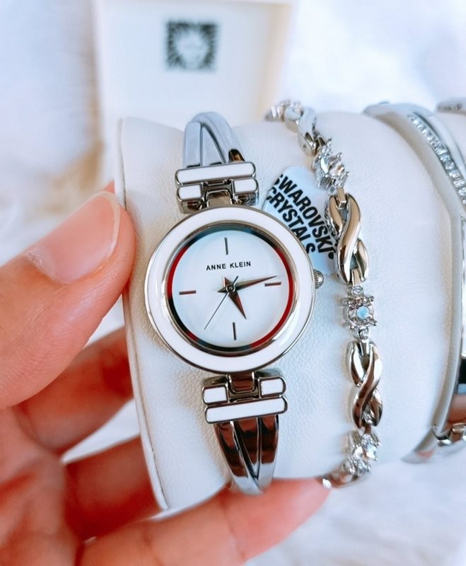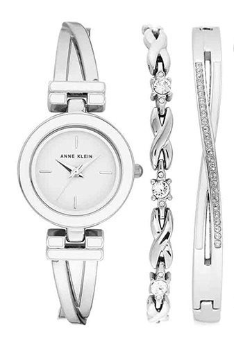 AK-3576WTST שעון יד אן קליין כסוף כולל2 צמידים תואמים | שעון מששולב כסף ולבן | אבני סברובסקי | Anne Klein Swarovski Crystal Accented Silver-Tone Bangle Watch Set AK/3576WTST