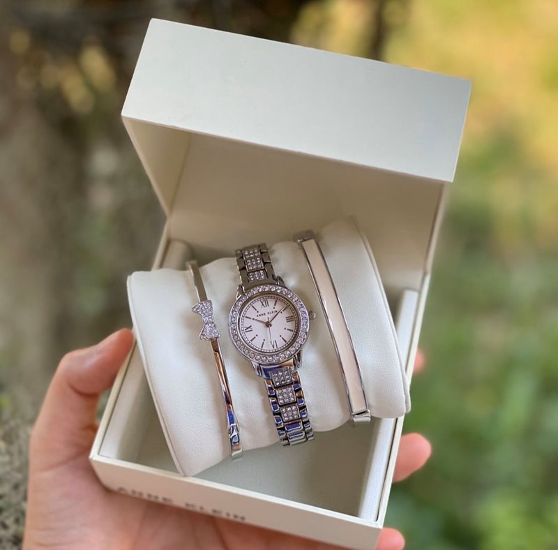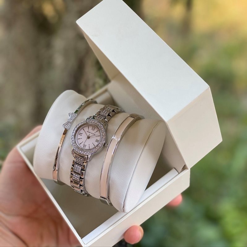 AK-3334LPST סט שעון ו 2 צמידים משובצים אבני סברובסקי | שעון אופנתי כסוף של אן קליין | מלאי מוגבל | Anne Klein Pink Dial Quartz Ladies Watch and Bracelet Set