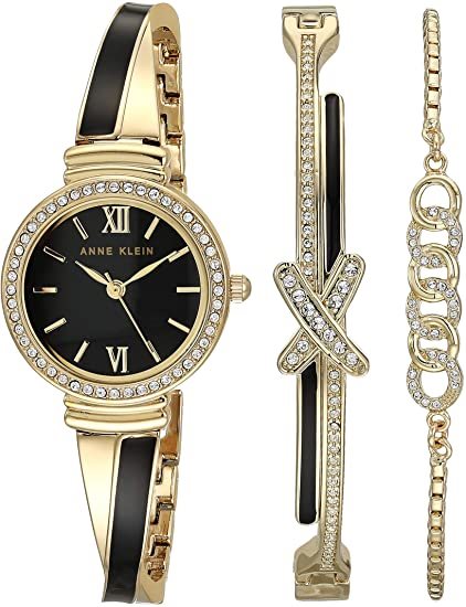 AK-3572BKST סט שעון וצמידים לנשים / נערות של אן קליין | שעון שחור זהב משובץ אבני סברובסקי | מחירי חיסול מלאים | Anne Klein Women's Swarovski Crystal Accented
