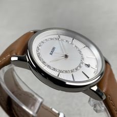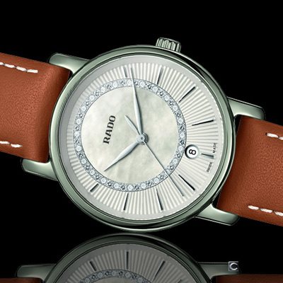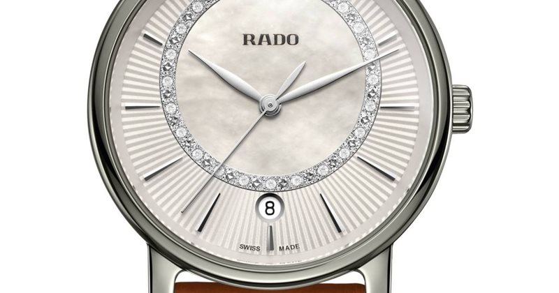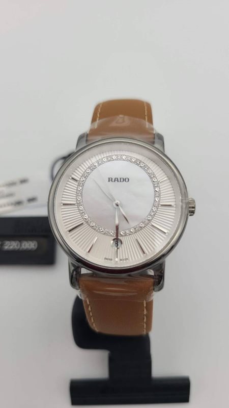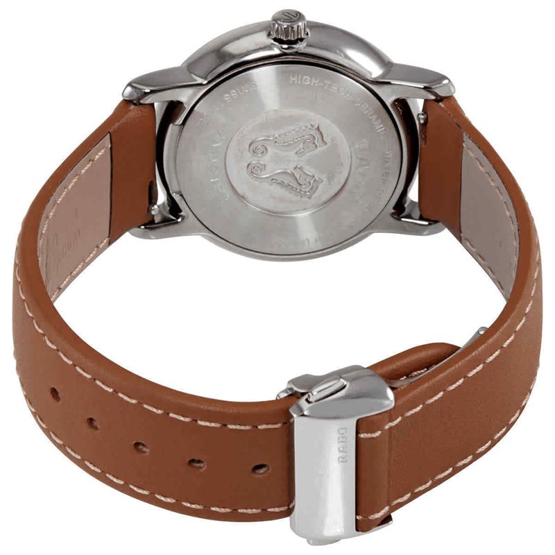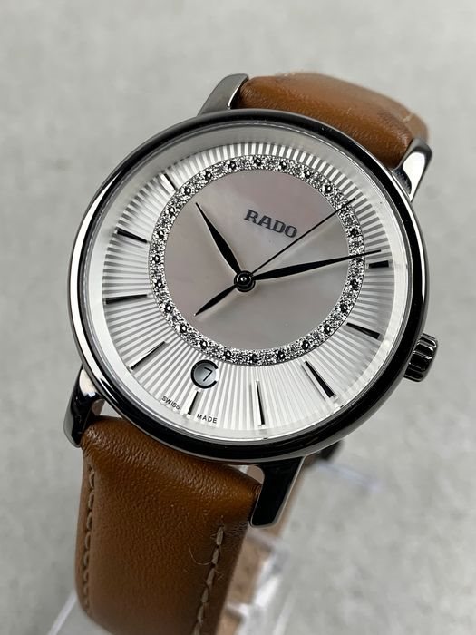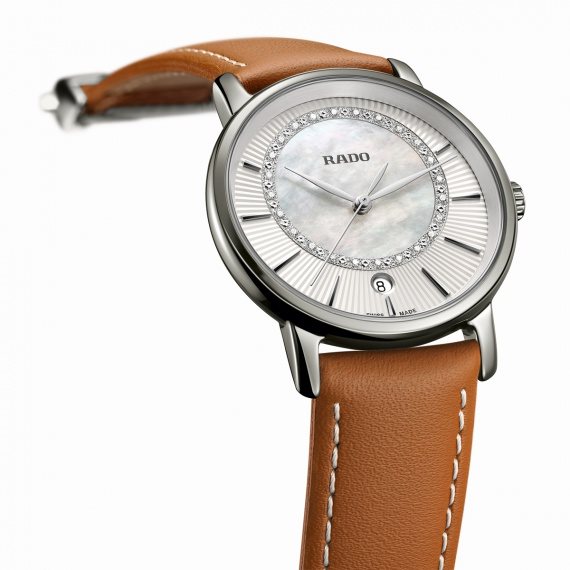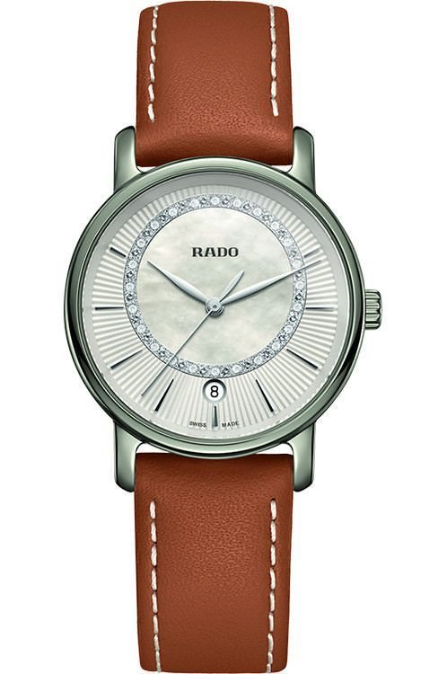 R14064945 שעון יד ראדו אלגנטי לנשים ברצועת עור חומה | לוח פנינה מיוחד משובץ יהלומים | מלאי מוגבל כולל שנתיים אחריות |DiaMaster Diamonds White Mother of Pearl Dial Ladies Watch R14064945