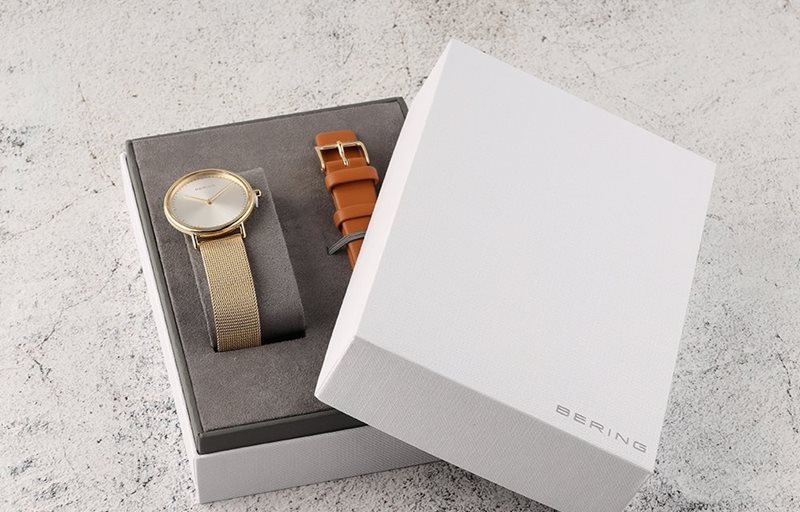 15729-530 שעון אופנתי לנשים של ברינג | דגם זהב כולל 2 רצועות | שעון עם זכוכת ספיר | רצועת עור אלגנתית להחלפה מהירה | Bering Ultra Slim 15729-530 Watch