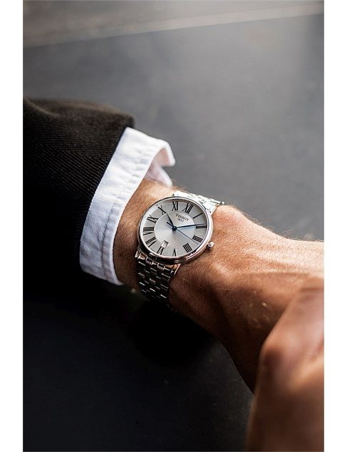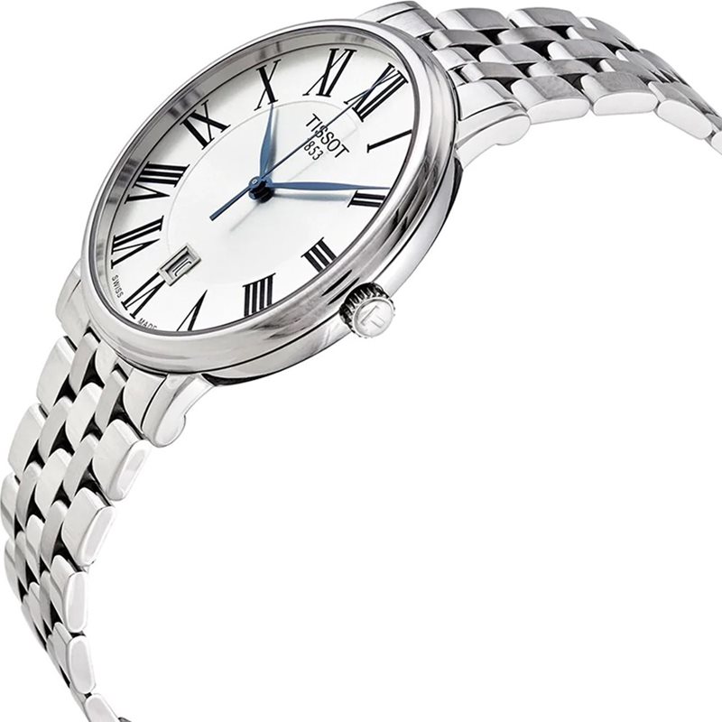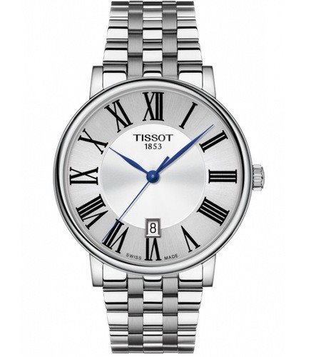 T122.410.11.033.00 טיסו לגבר שעון יוקרתי אופנתי בלוח כסוף רומי כולל תאריכון | מחוגים כחולים | אחריות יבואן ל 3 שנים| שעונים שווצריים לגבר | Tissot Carson Premium T1224101103300 Men's Watch