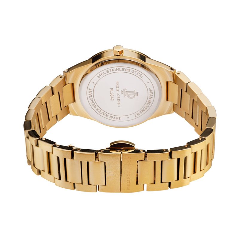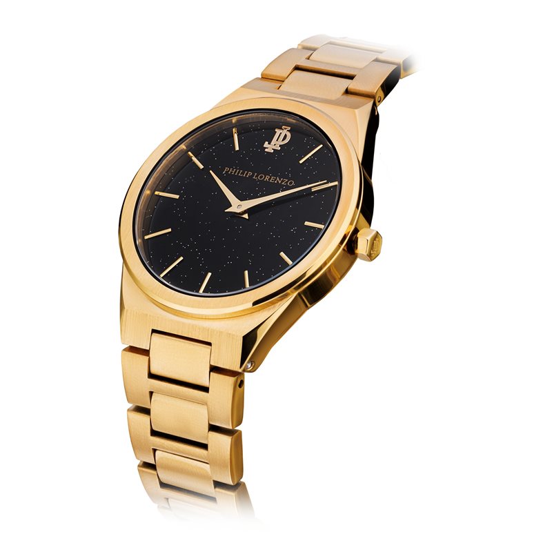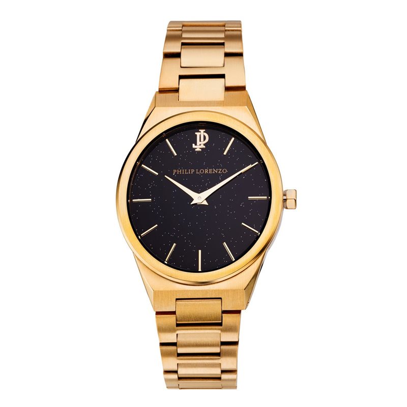 PL3842 שעון יד זהב לנשים של פיליפ לורנזו | לוח שחור נצנצים מיוחד | שעוני אופנה לנשים במבצע | שנתיים אחריות | PL3842 PHILIP LORENZO