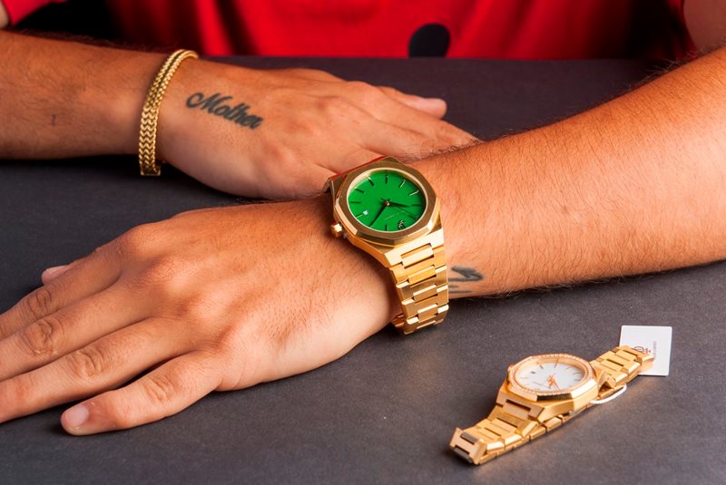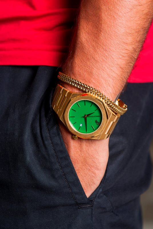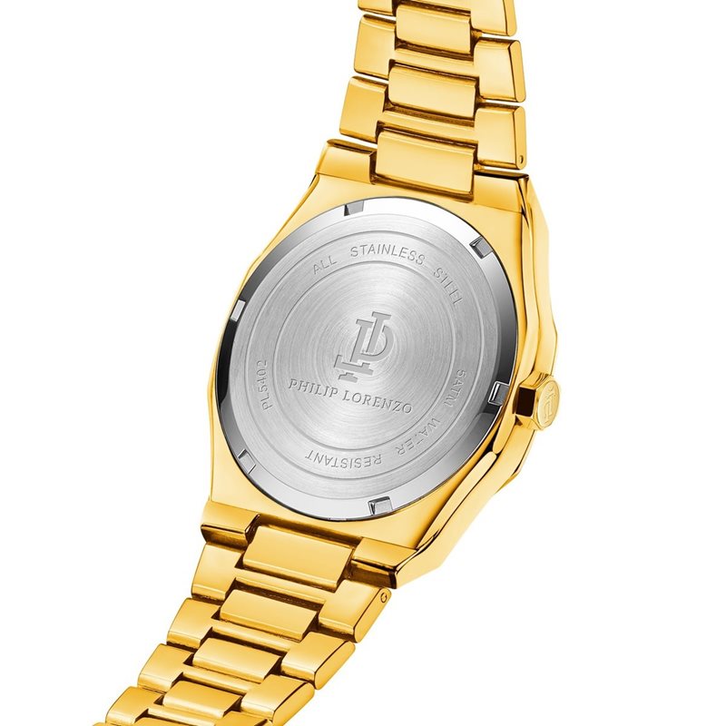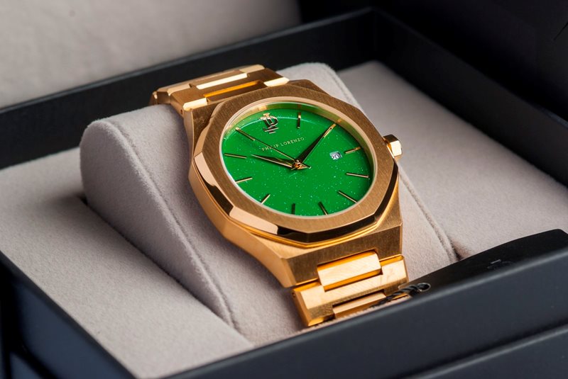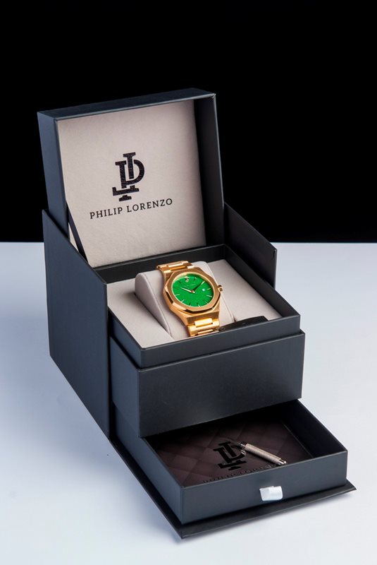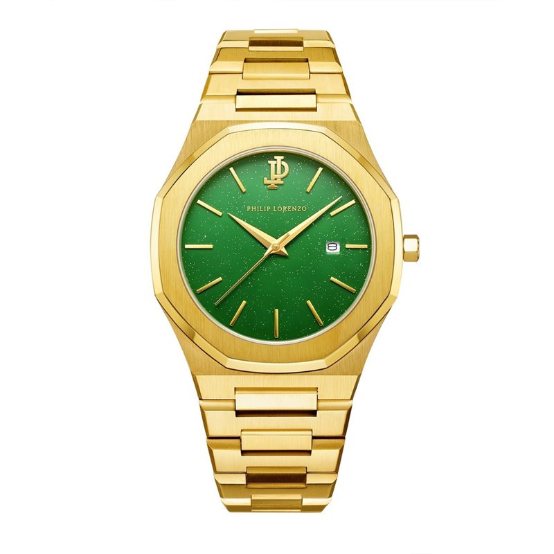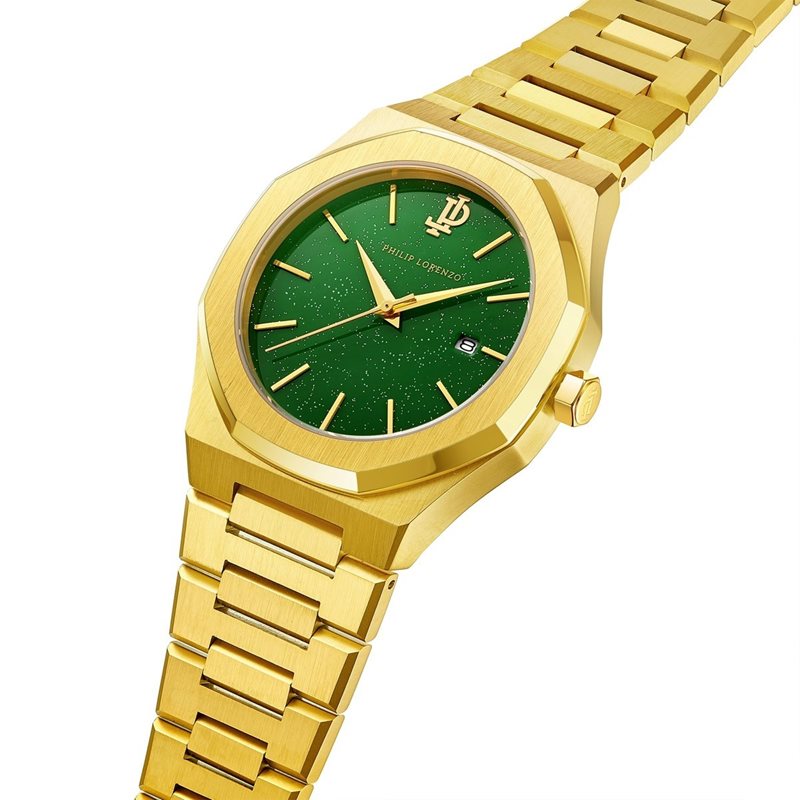 PL5402 שעון מיוחד של פיליפ לורנזו לגברים | דגם ברצועת מתכת זהב בלוח ירוק מרשים | מנגנון שווצרי כולל תאריכון | שעוני אופנה לגברים בראשון לציון | PL5402 PHILIP LORENZO