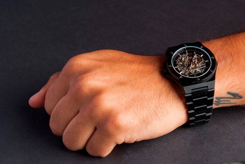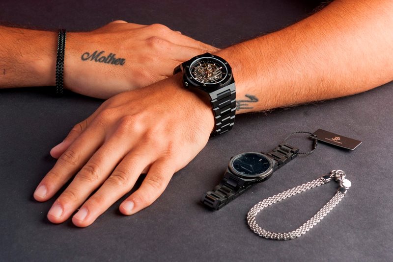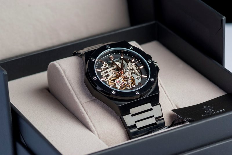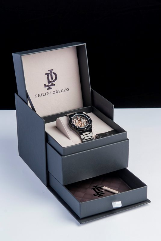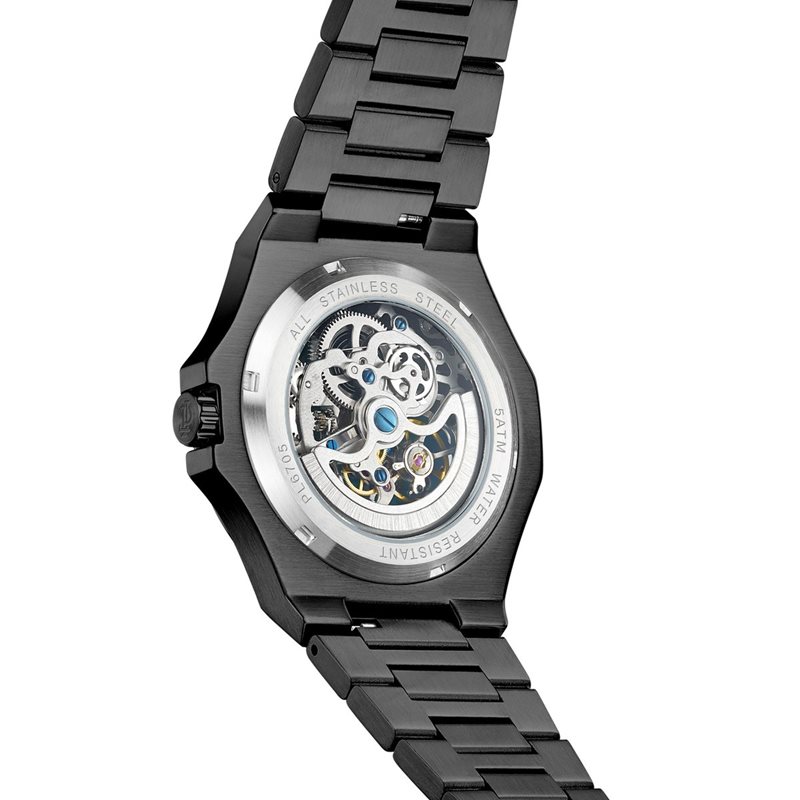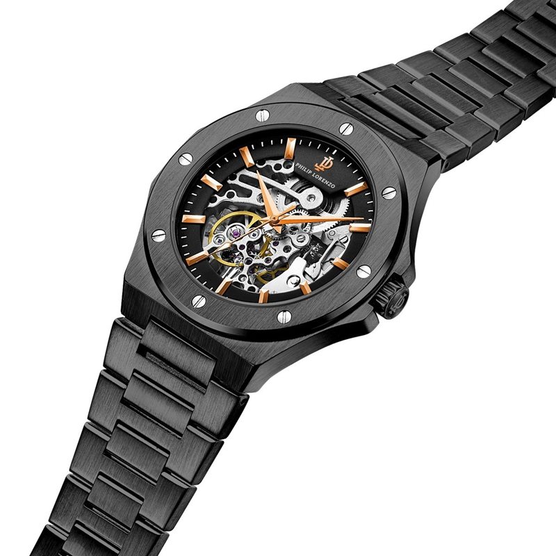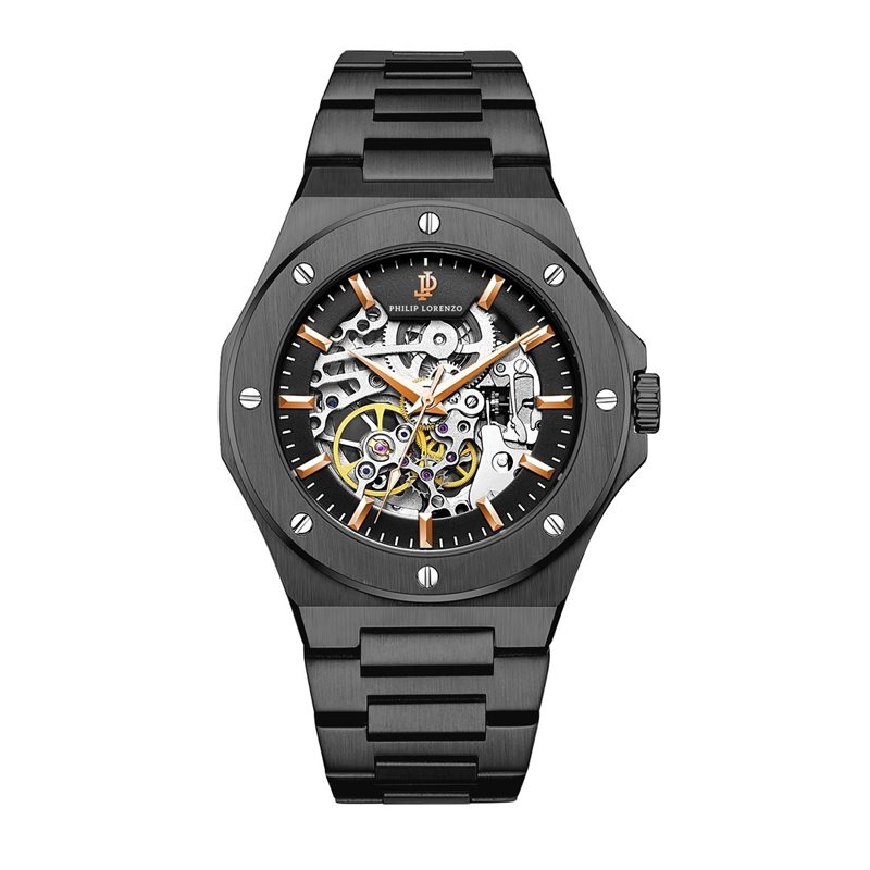 PL6705 שעון פיליפ לורנזו שחור | דגם לגברים סקלטון | שעון אופנתי אלגנטי אוטומטי בלוח וחלן אחריו שקוף | PL6705 PHILIP LORENZO