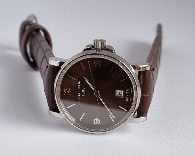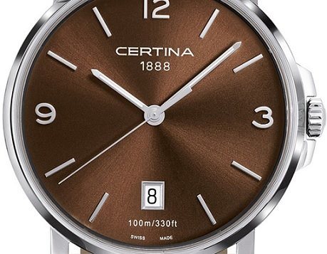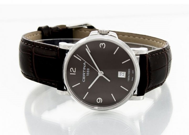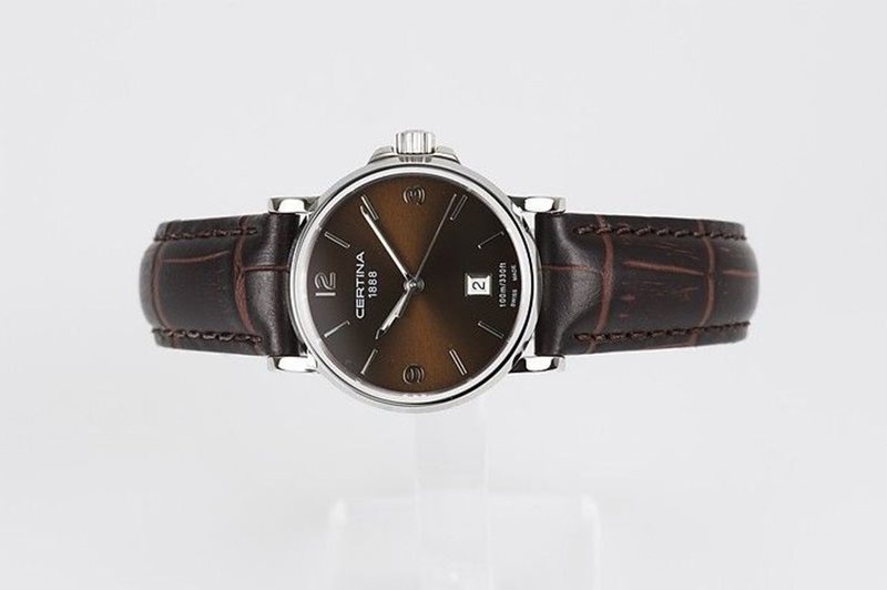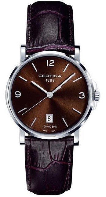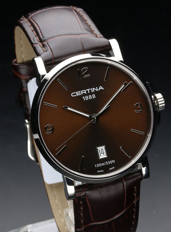 C017.410.16.297.00 שעון יד סרטינה קלאסי אלגנטי לגברים בלוח חום ורצועת עור חומה | כולל תאריכון ו5 שנים אחריות | Certina DS Caimano Genuine Brown Leather Quartz Watch C0174101629700