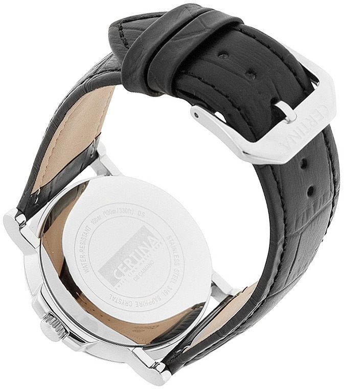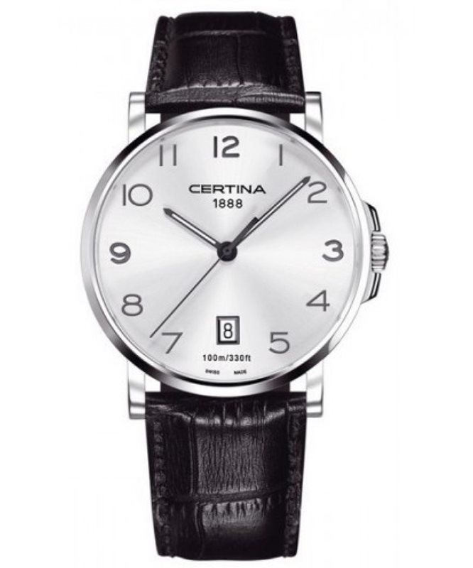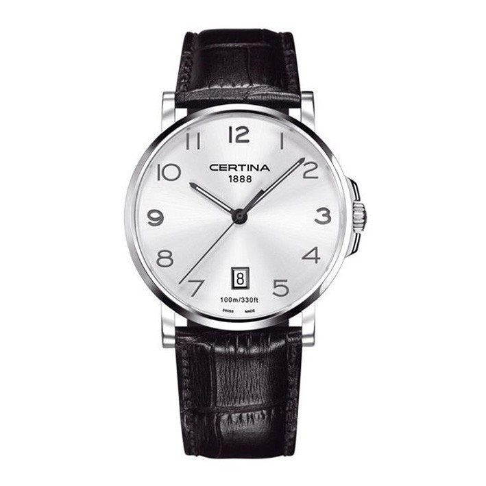 C017.410.16.032.00 שעון סרטינה אלגנטי קלאסי לגברים בלוח כסוף מספרים| רצועתת עור שחורה כולל 5 שנים אחריות | Certina DS Caimano Silver Dial Black Leather Men's Watch C0174101603200
