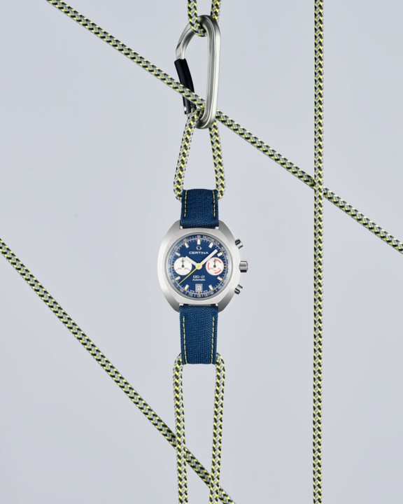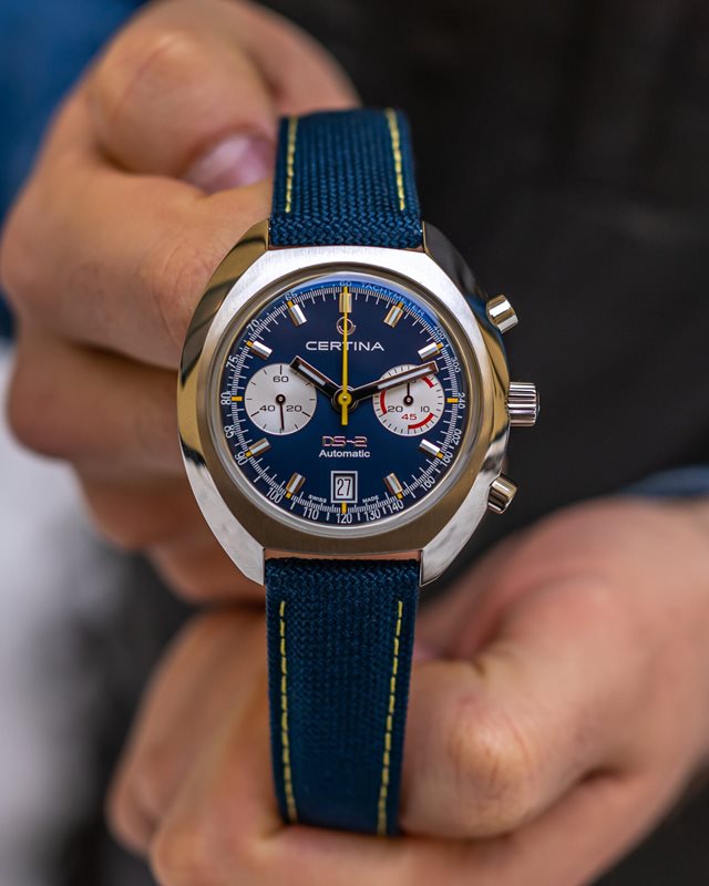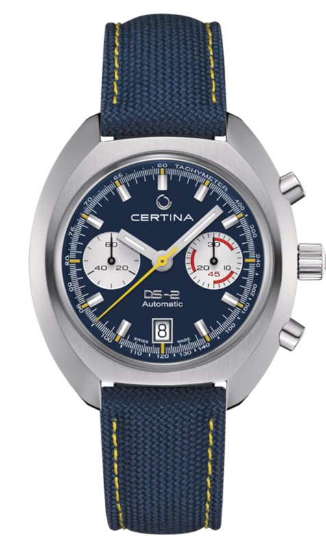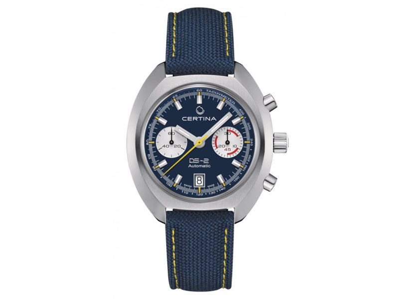 C024.462.18.041.00 שעון סרטינה מיוחד בעיצוב רטרו | דגם 2023 בלוח כחול כרונוגרף | רצועה תואמת מנגון אוטומטי חלון אחורי שקוף 5 שנים אחריות | Certina Sport DS-2 Automatic Chronograph C0244621804100