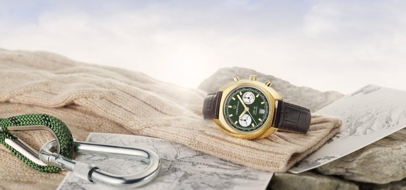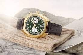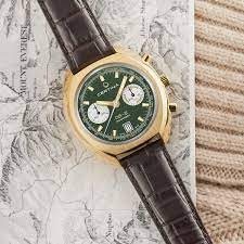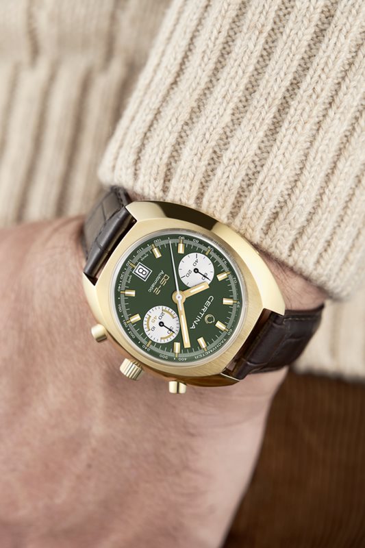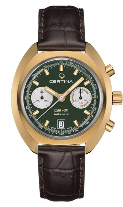 C024.462.36.091.00 שעון חדש של סרטינה לגברים בסגנון רטרו | שעון אלגנטי זהב בלוח ירוק מיוחד מנגון אוטומטי כולל 5 שנים אחריות | Certina DS-2 Automatic Chronograph Green / Brown Leather C0244623609100