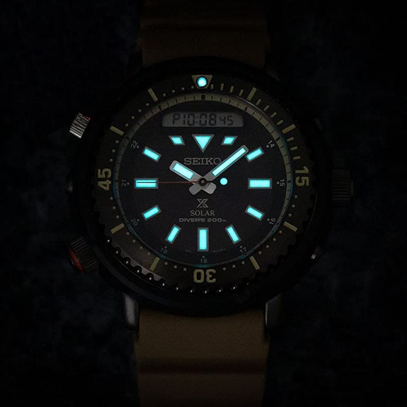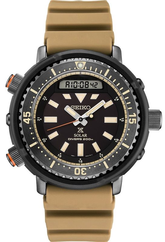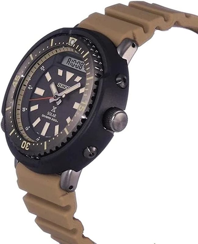 SNJ029P1 שעון סייקו פרוספקס סולארי דגם חדש לגברים מסדרת ספארי | אחריות יבואן רישמי בישראל | שעון אנלוגי דיגטלי ברצועת סיליקון חומה | Seiko Arnie Prospex SNJ029 Tuna Solar