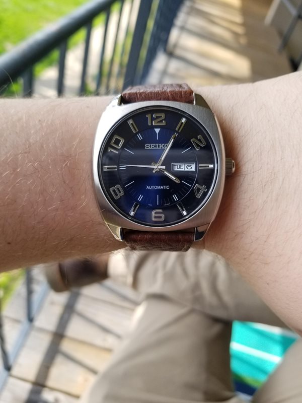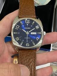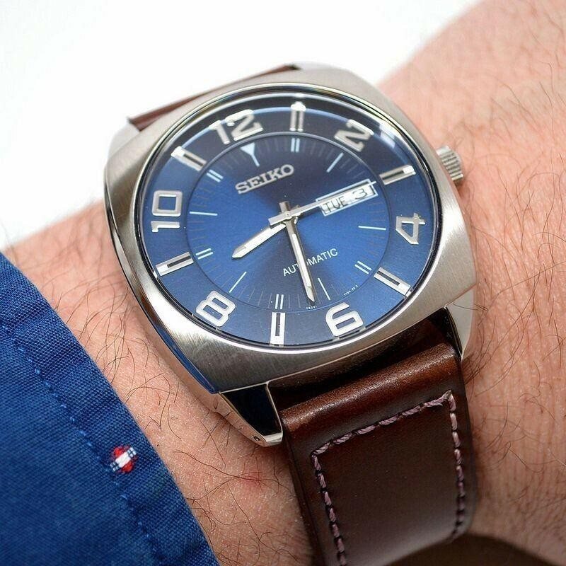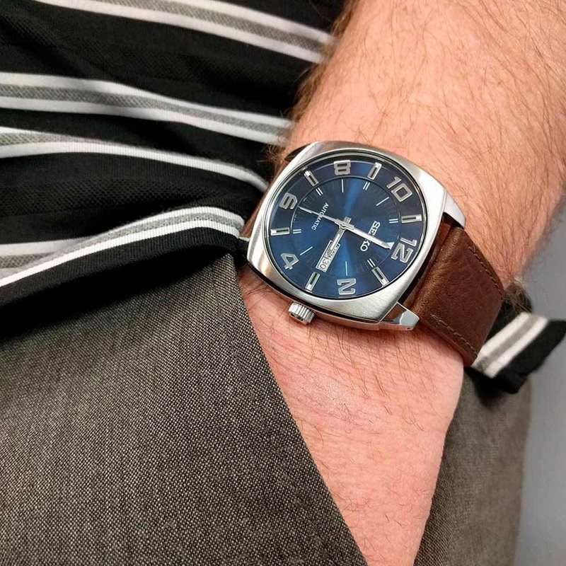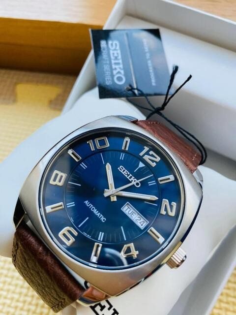 SNKN37 שעון סייקו מיוחד לגברים בסגנון וינט'ג | לוח כחול ברצועת עור חומה | מנגנון אוטומטי תאריכון ימים | שנתיים אחריות | Seiko Recraft Automatic Blue Dial Brown Leather SNKN37