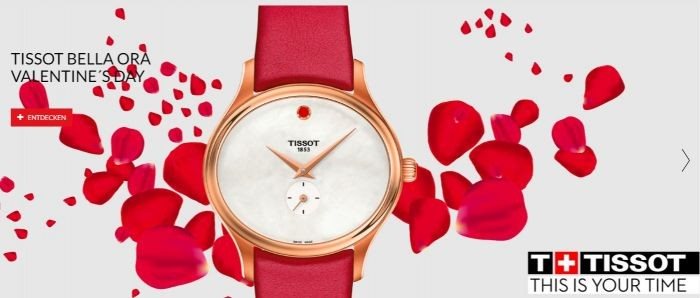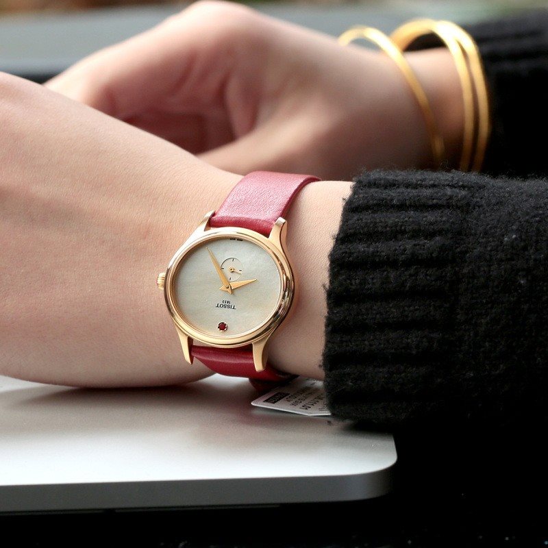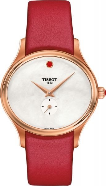 T103.310.36.111.01 שעון אופנתי של טיסו לנשים | דגם אובלי רוז גולד בלוח פנינה עם שעון שניות בלוח | רצועת עור אדומה מיוחדת | מלאי מוגבל | שנתיים אחריות | Tissot Bella Ora Saint Valentine T1033103611101