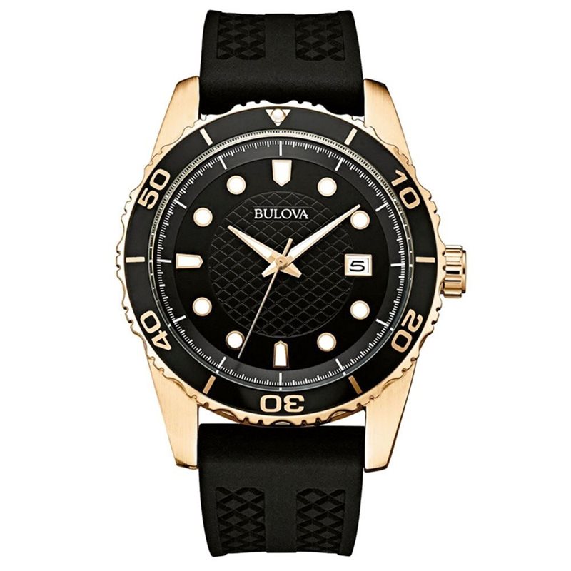 98B261 שעון בולובה ספורטיבי אלגנטי רוז גולד בלוח שחור זוהר בחשכה | דגם לגברים כולל שנתיים אחריות | Bulova Men's Black Silicone Strap Watch 43mm 98B261