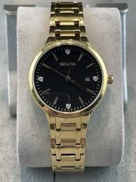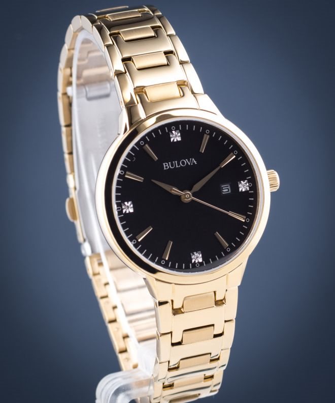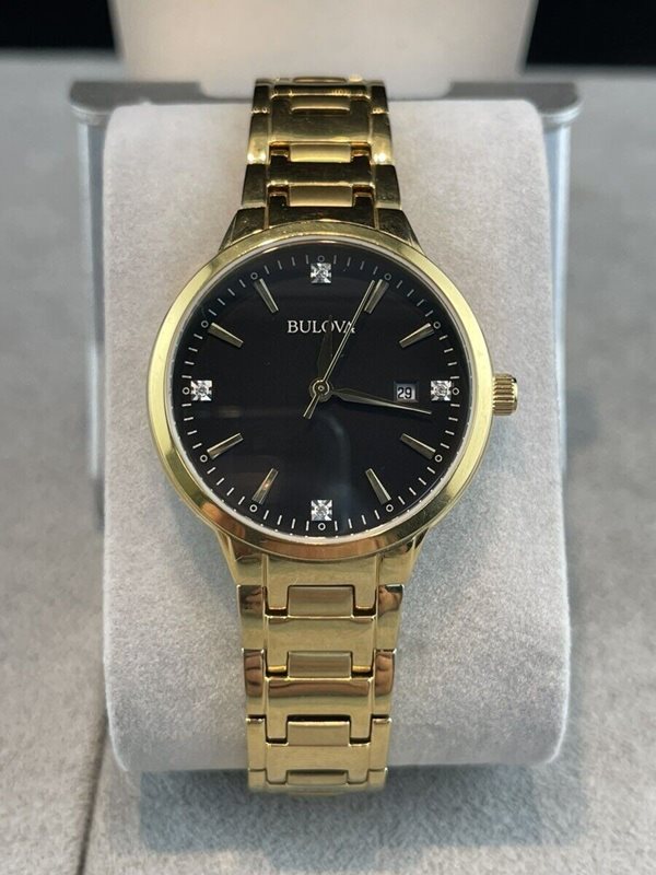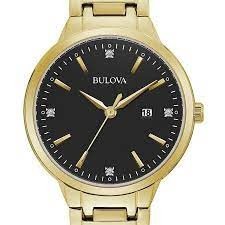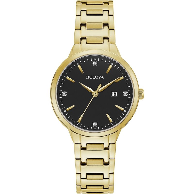 97P147 שעון זהב של בולובה משובץ 4 יהלומים | לוח שחור כולל תאריכון | שנתיים אחריות | מלאי מוגבל | Bulova Diamond Black/Yellow gold toned steel 97P147