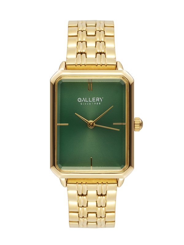 17834-11 שעון גלרי מלבני אופנתי לאישה בלוח ירוק מיוחד | רצועת פלדת אל חלד בצבע זהב | שנתיים אחריות | gallery stainless steel ladies watch 17834-11