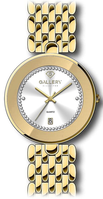 17524-12 שעון זהב של גלרי בלוח כסוף משובץ זרקונים בלוח השעון | כולל תאריכון וזכוכית ספיר | gallery stainless steel ladies watch 17524-12