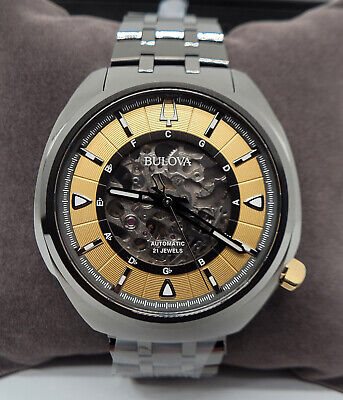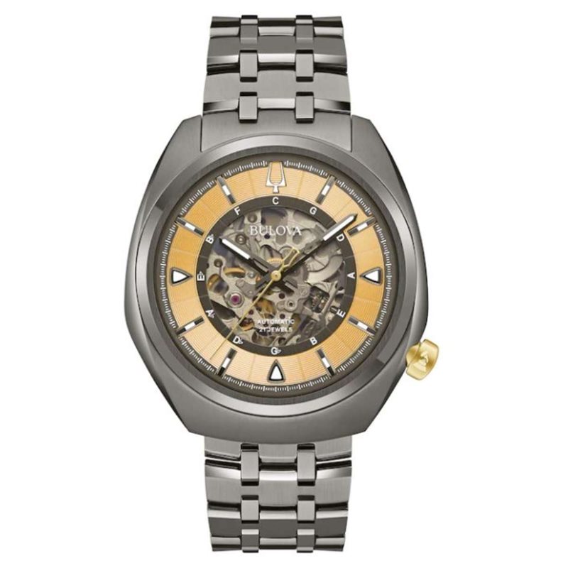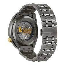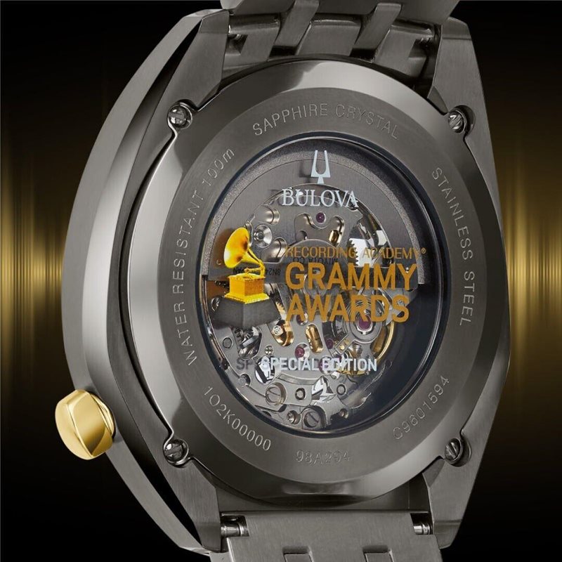 98A294 שעון בולובה במהדורה מיוחדת לפרסי הגרמי | דגם אוטומטי סקלטון | לוח זהב מיוחד | צבע אפור וכתר זהב | שנתיים אחריות | מלאי מוגבל | Bulova Grammy Edition Automatic Skeleton Dial Men's Watch 98A294