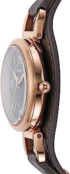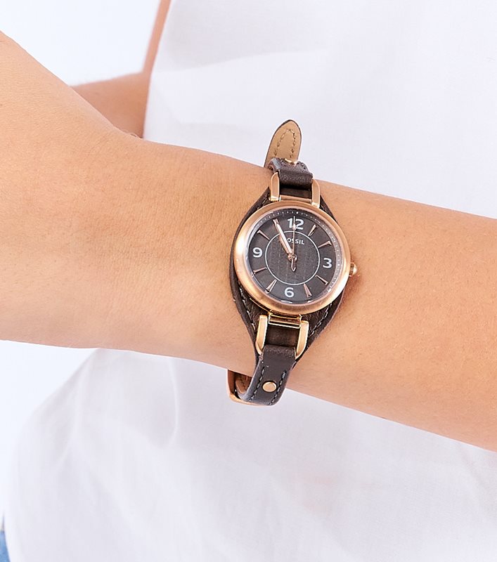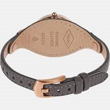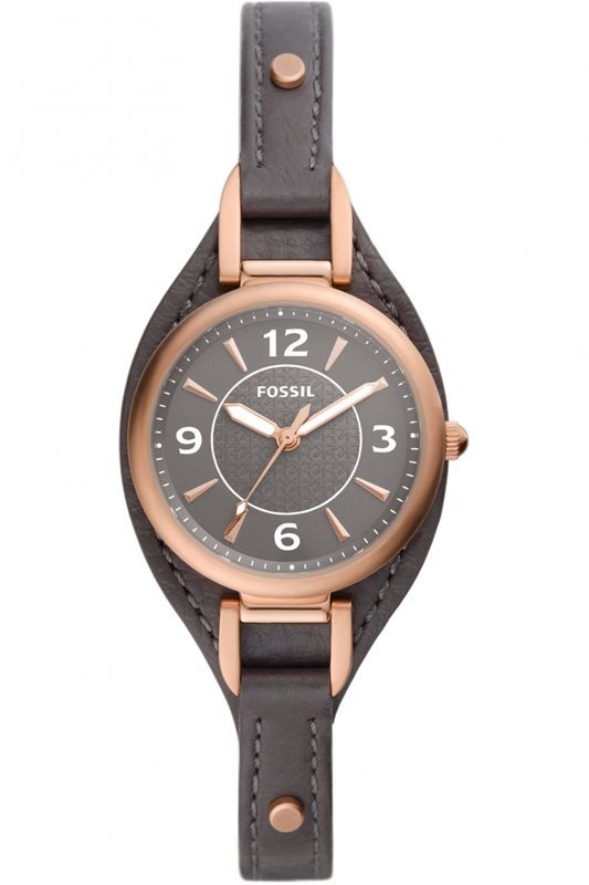 ES5212 שעון פוסיל לנשים ברצועת עור מיוחדת | רוז גולד בלוח אפור | מחוגים זוהרים כולל שנתיים אחריות | Carlie Three-Hand Black Eco Leather Watch ES5212