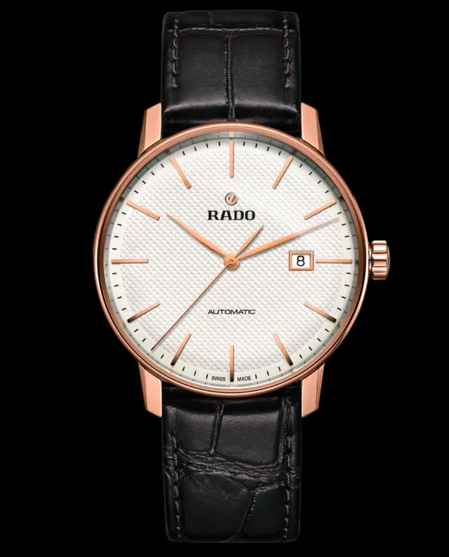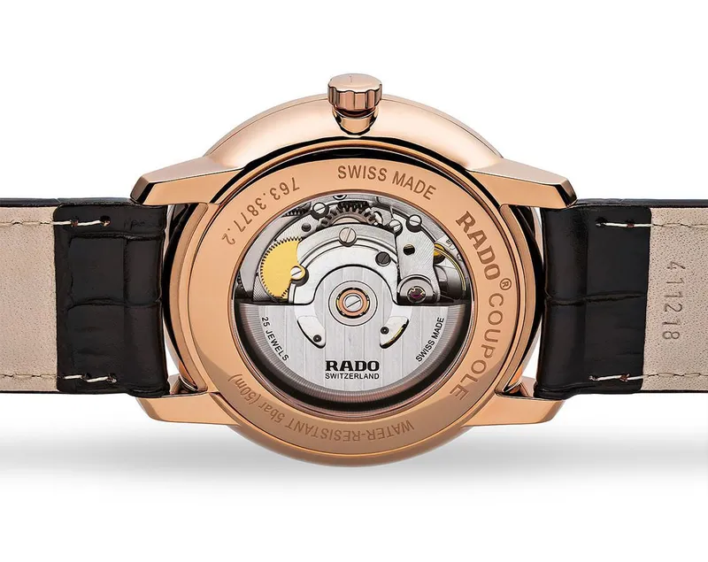 R-38772102 שעון ראדו מסדרת קופל לגברים | דגם רוז גולד אוטומטי בלוח לבן מיוחד | 5 שנים אחריות מלאי מוגבל | חלון אחורי שקוף | R22877025 Rado Coupole Classic Automatic White Dial