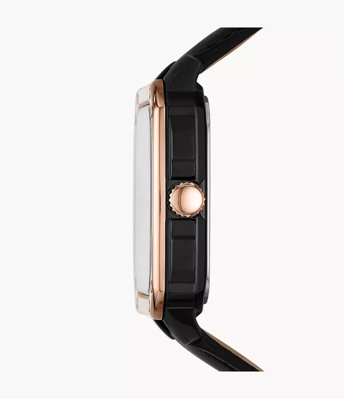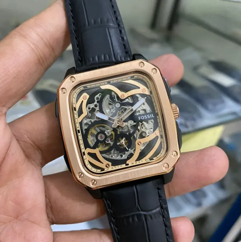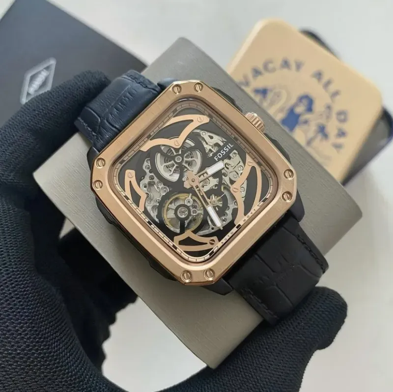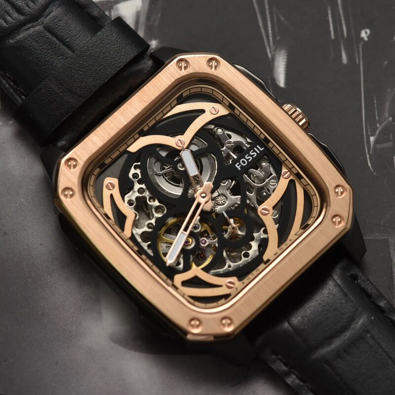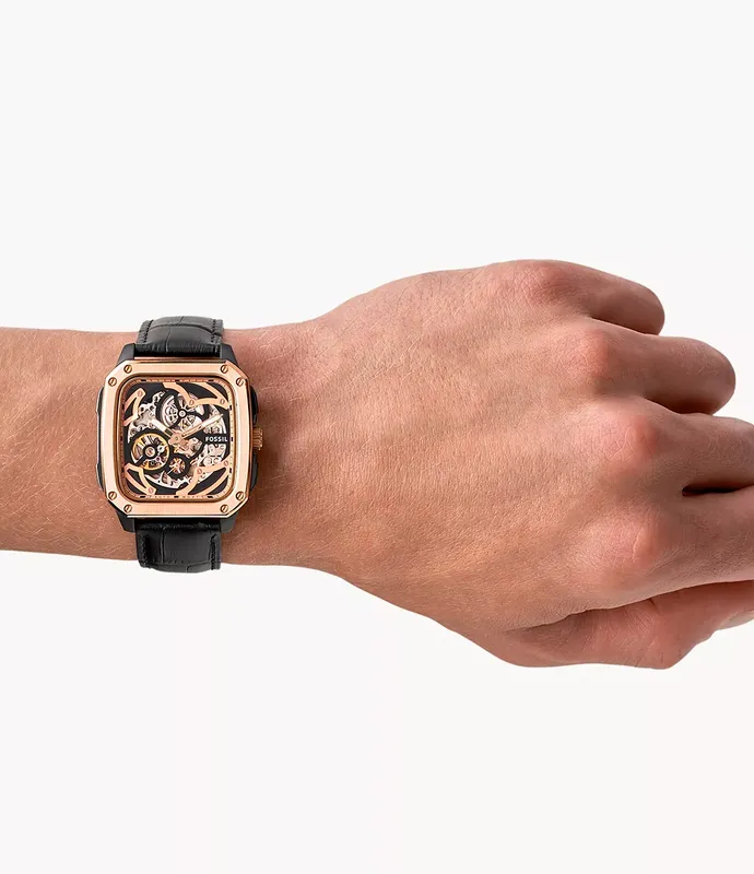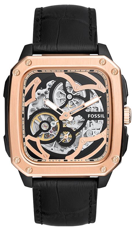 BQ2572 שעון יד פוסיל דגם מלבני סקלטון אוטומטי מיוחד | קולקציית שעונים חדשה בישראל | רצועת עור משולב רוז גולד | Inscription Automatic Black Skeleton Dial Men's Watch BQ2572 by Fossil