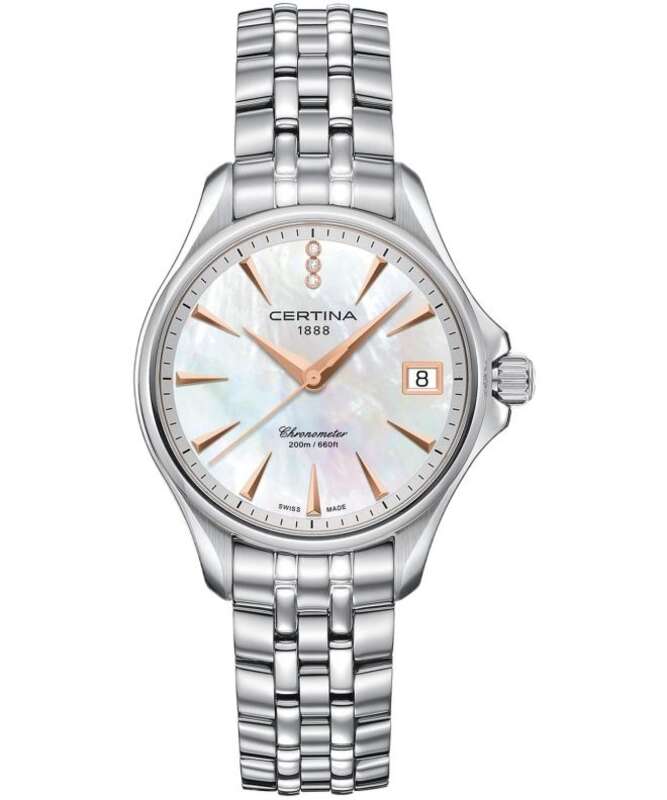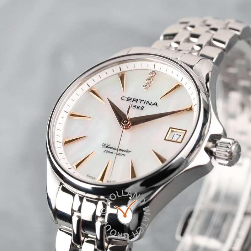C032.051.11.116.00 שעון סרטינה בלוח פנינה לאישה משובץ | שעון יוקרה עם עמידות למים | 5 שנים אחריות יבואן רישמי | Certina, Womens, DS ACTION Lady Diamonds, Stainless Steel, Swiss Watch, C0320511111600