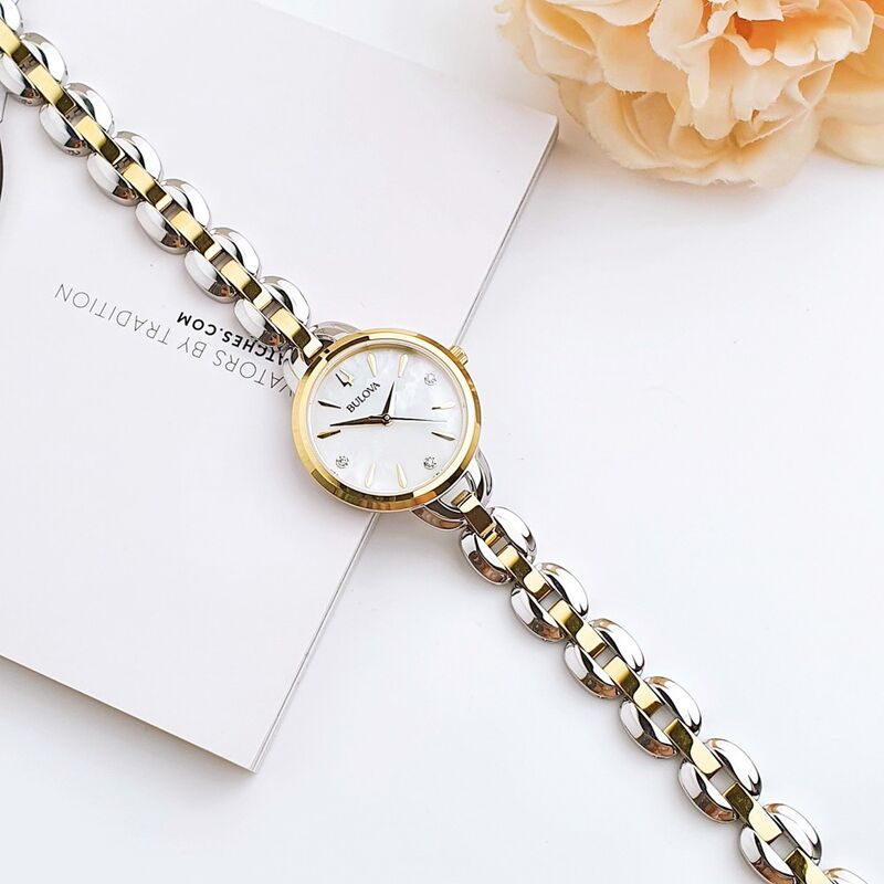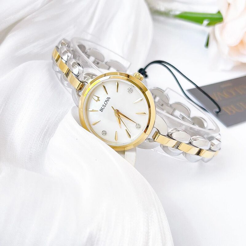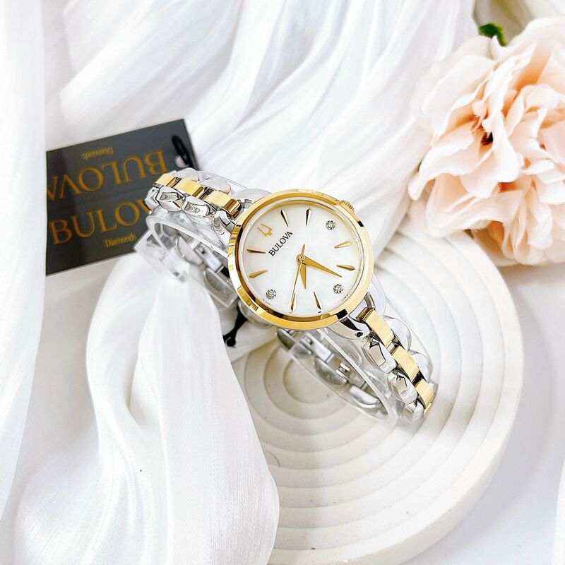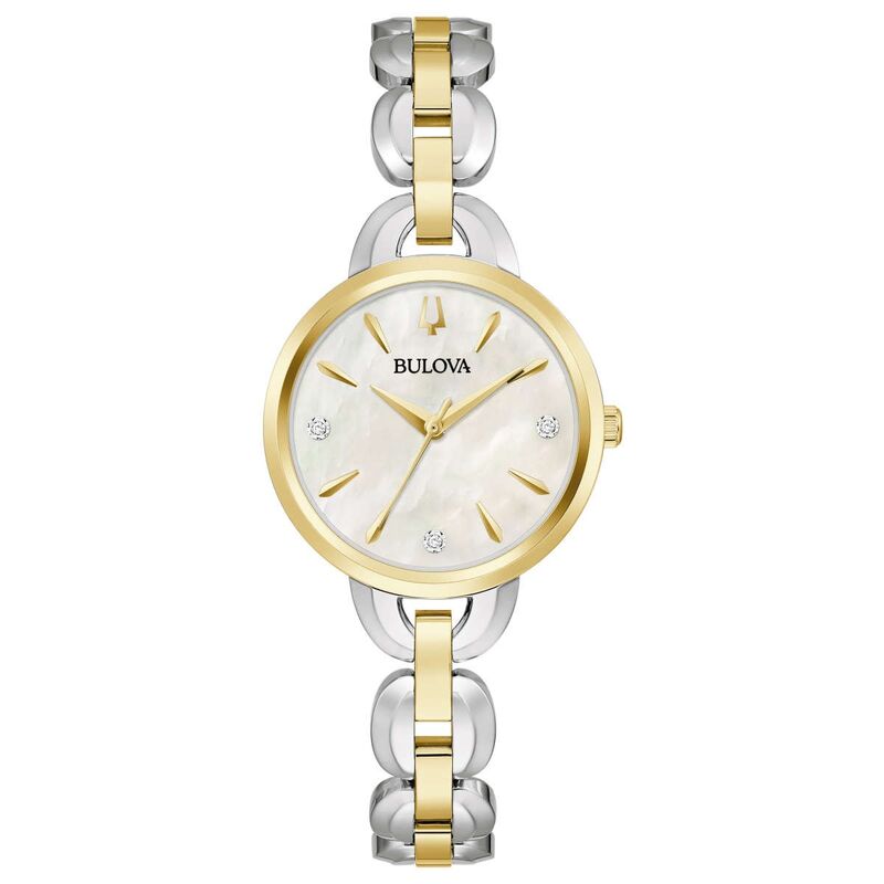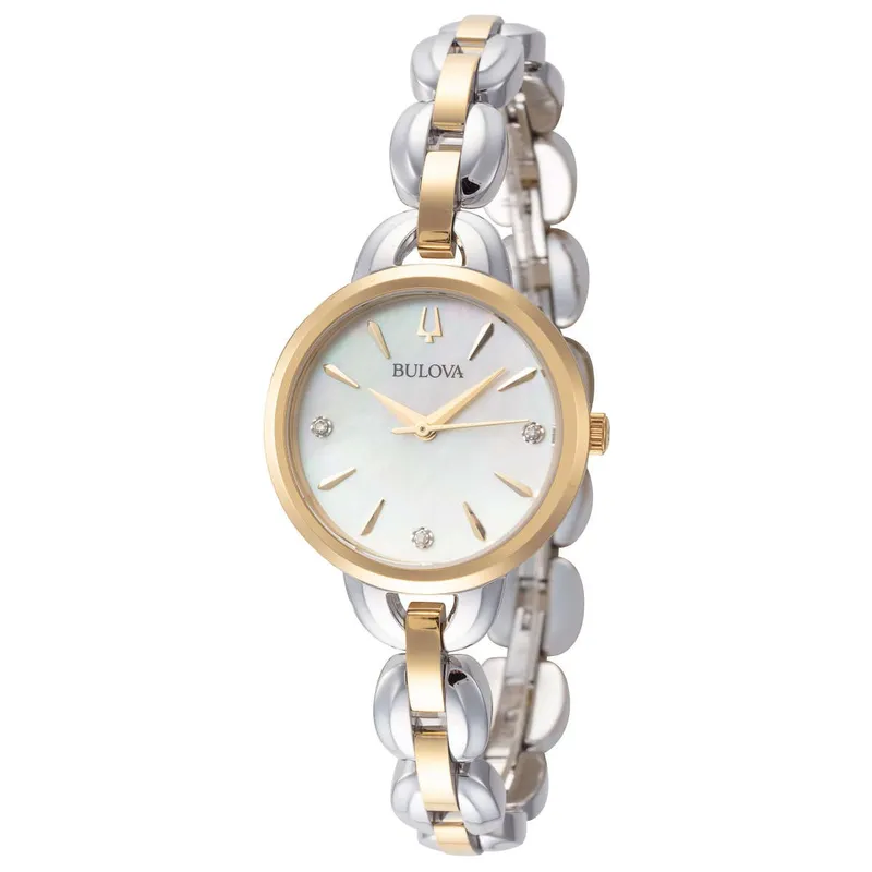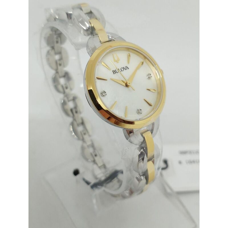 98P212 שעון יד צמיד בולובה לאישה דגם משולב זהב | לוח לבן פנינה משובץ 3 יהלומים | מלאי מוגבל | Bulova 98P212 Classic Diamond Mother of Pearl Dial Two-Tone Ladies Watch