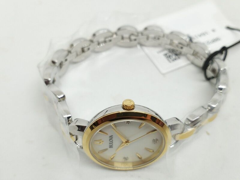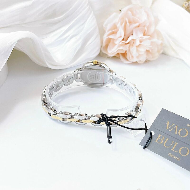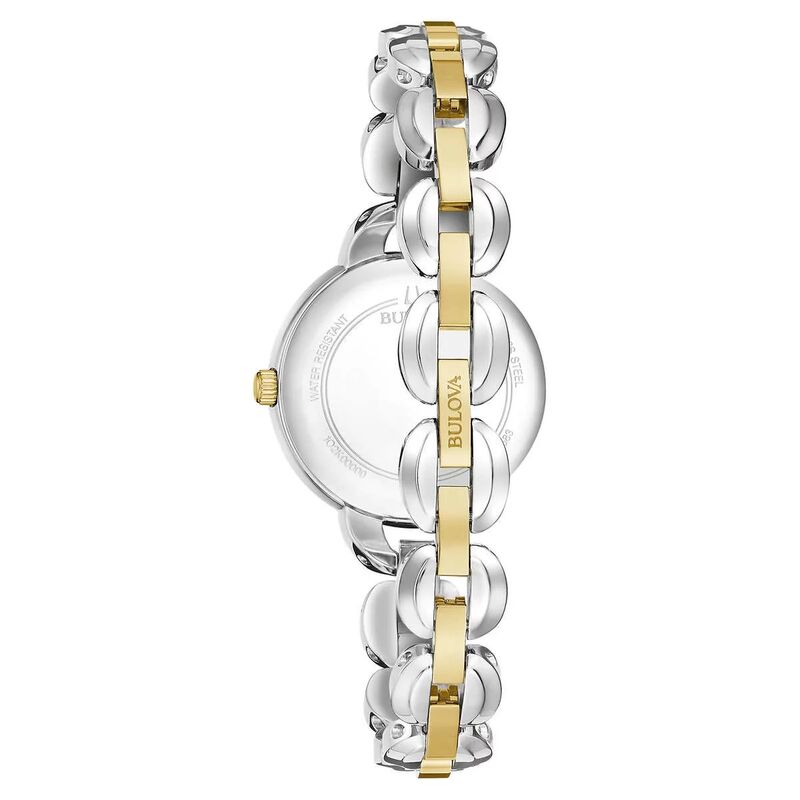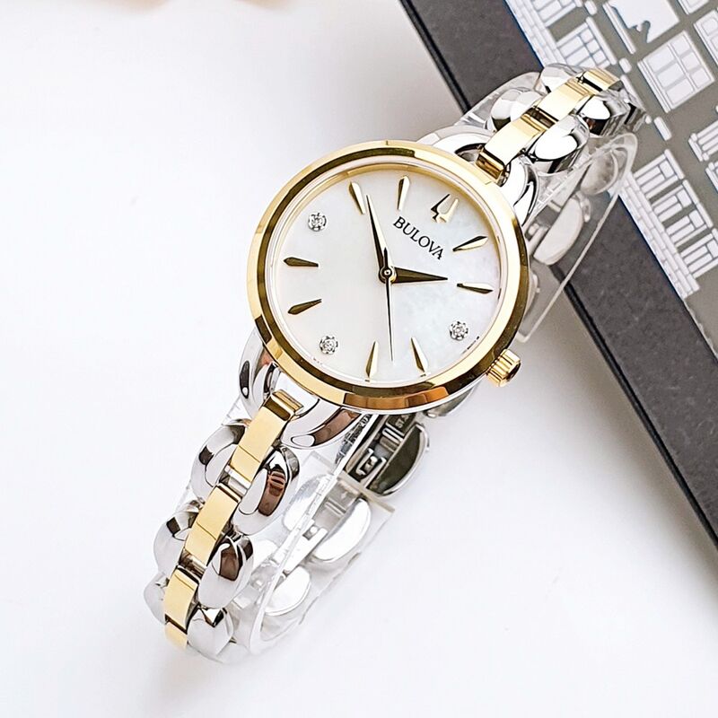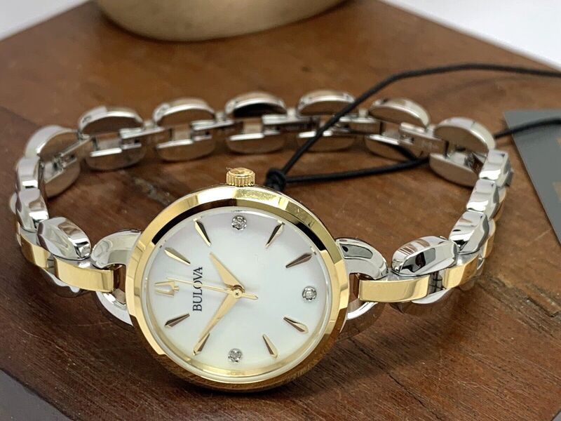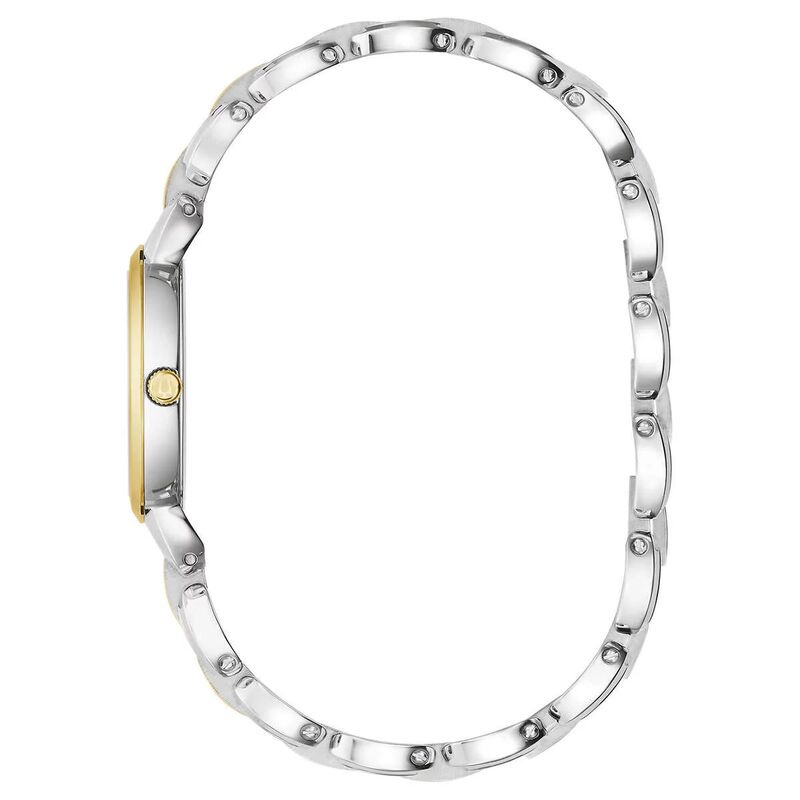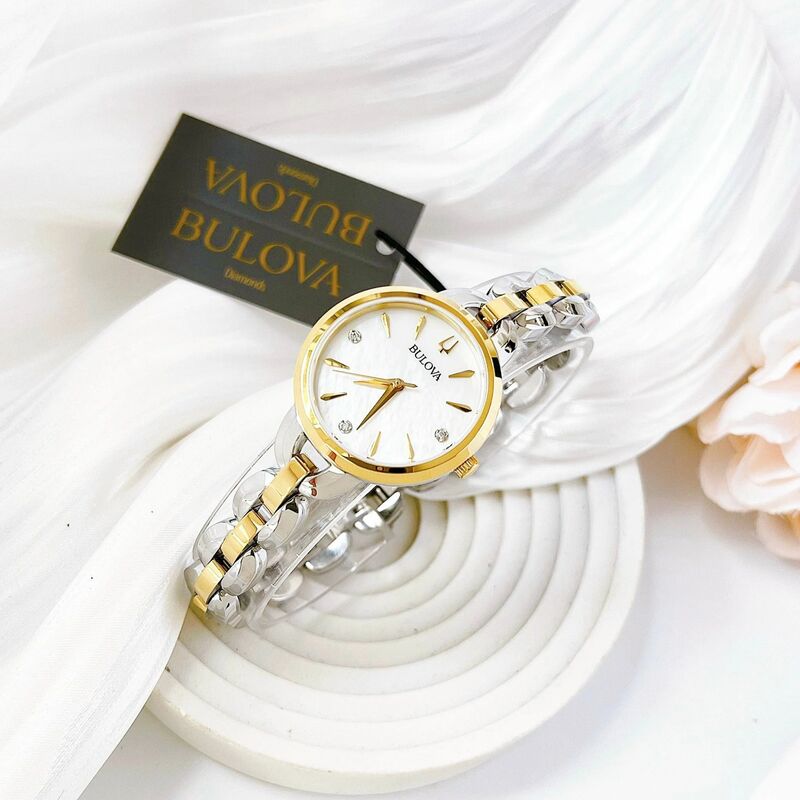 98P212 שעון יד צמיד בולובה לאישה דגם משולב זהב | לוח לבן פנינה משובץ 3 יהלומים | מלאי מוגבל | Bulova 98P212 Classic Diamond Mother of Pearl Dial Two-Tone Ladies Watch