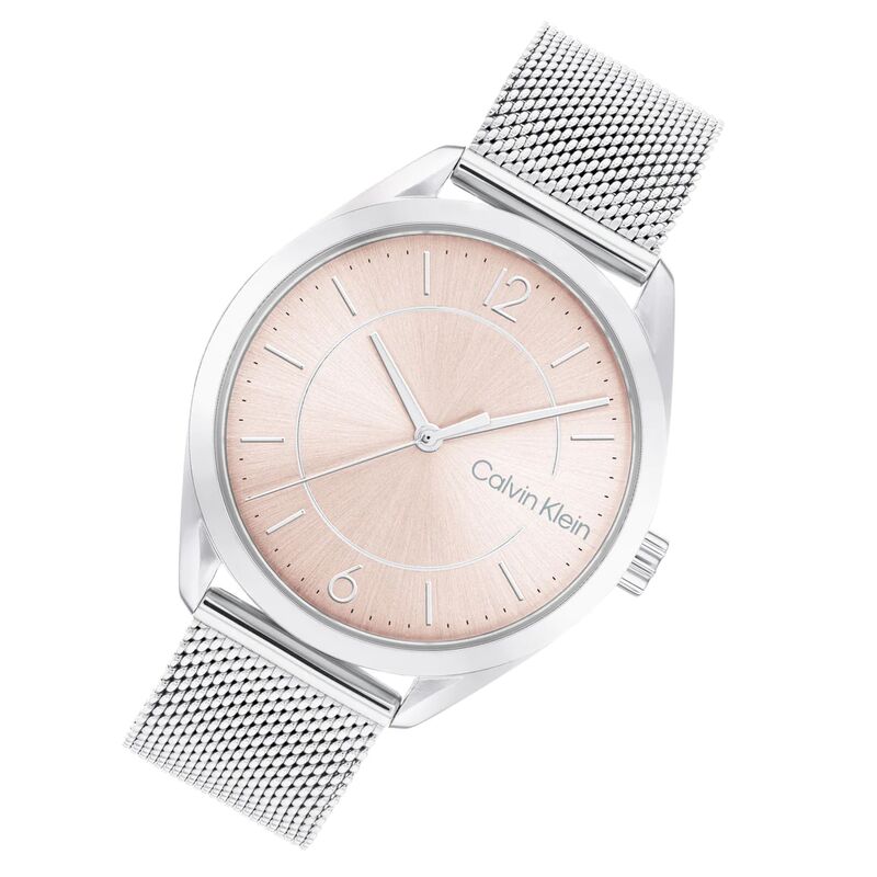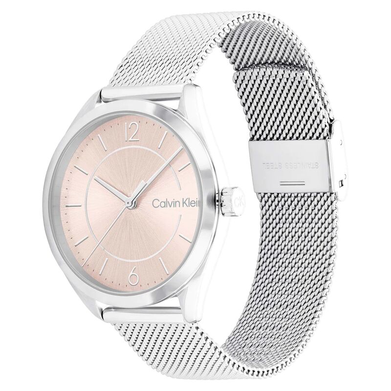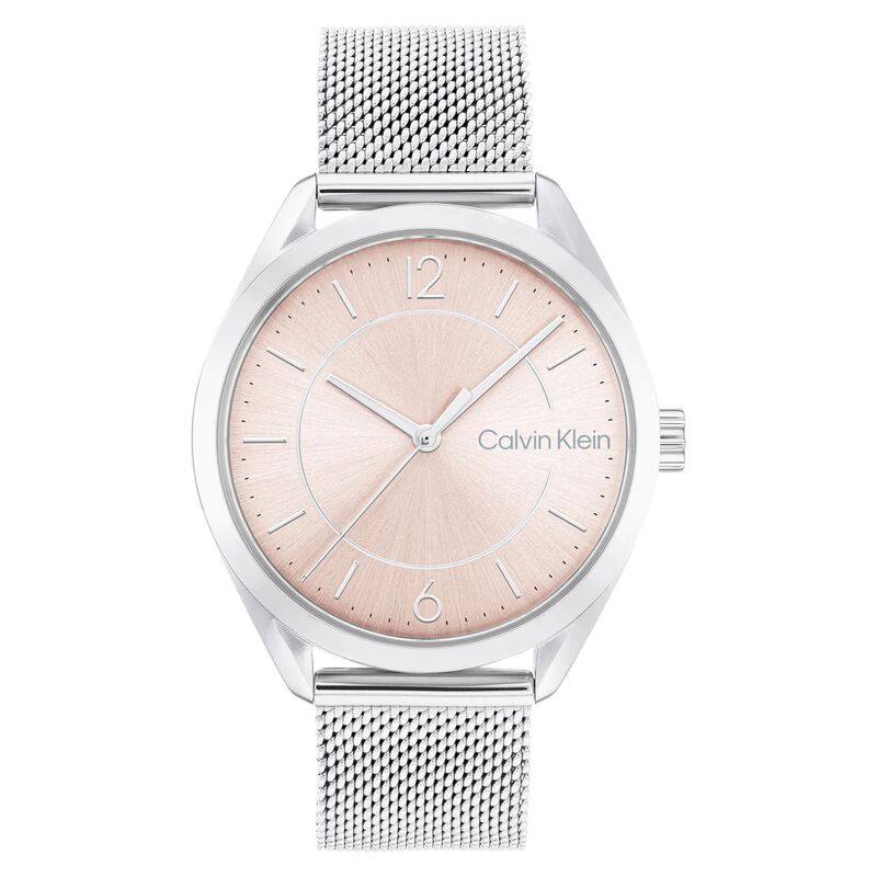 25200193 קלווין קליין שעון חדש 2024 לנשים בלוח ורוד מיוחד | רצועת רשת | שנתיים אחריות | מלאי מוגבל | Ladies Watch CALVIN KLEIN Silver Stainless Steel Bracelet 25200193