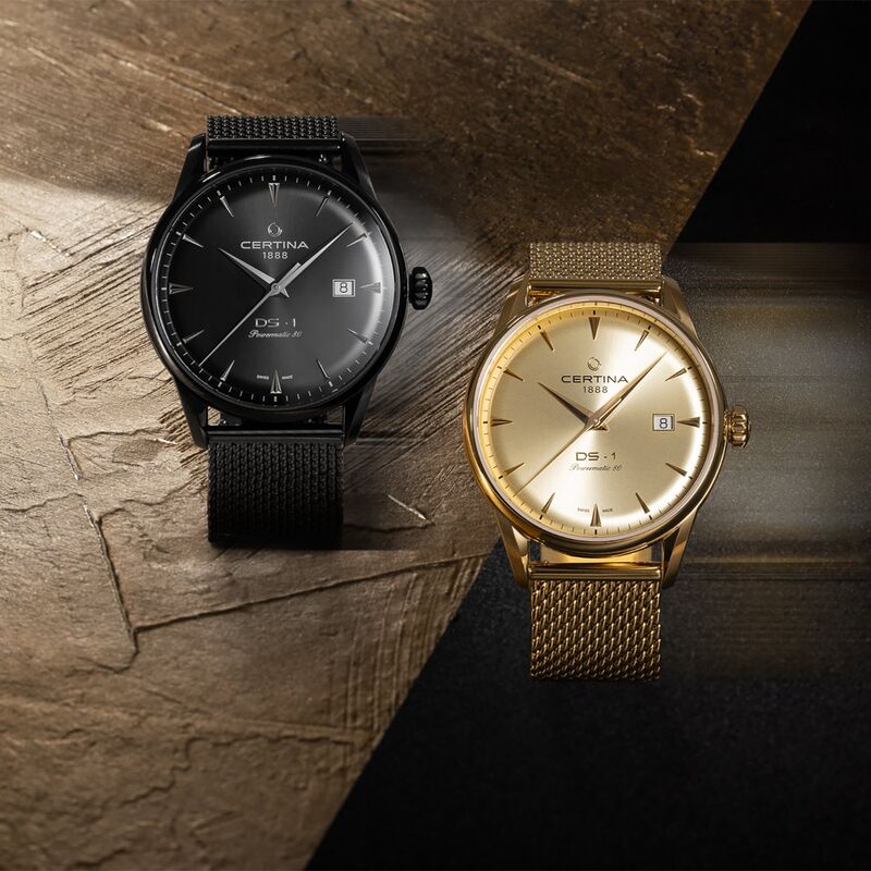C029.807.33.361.00 שעון סרטינה לגברים מהסדרה החדשה | שעון זהב בלוח זהב רצועת רשת | מנגנון פאוורמטיק 80 | 5 שנים אחריות | Certina DS-1 Powermatic 80 watch C029.807.33.361.00