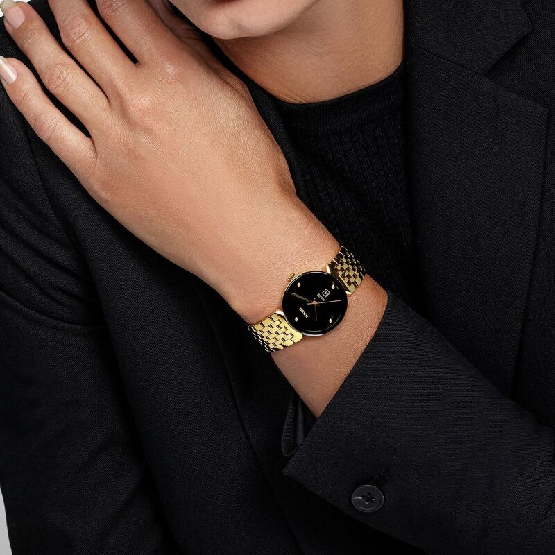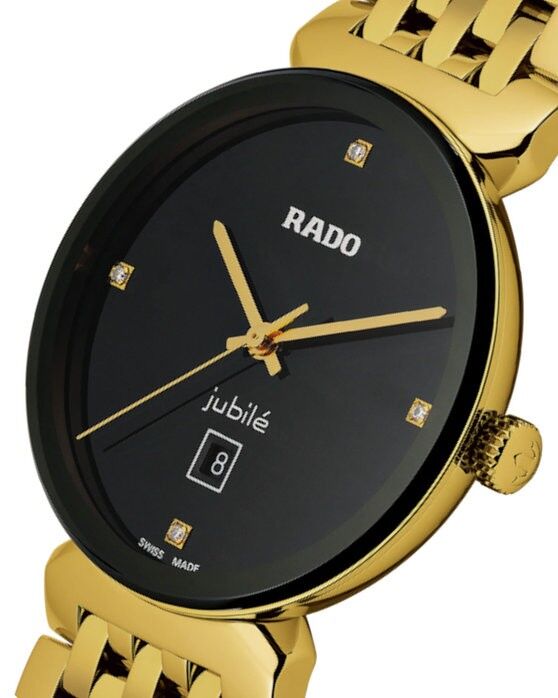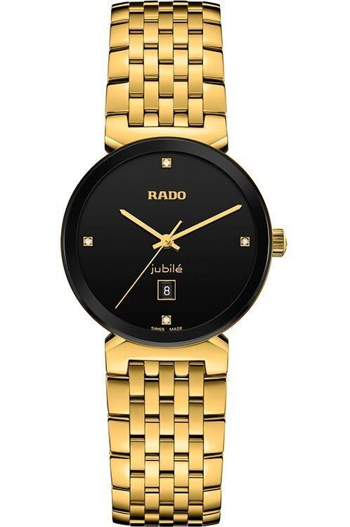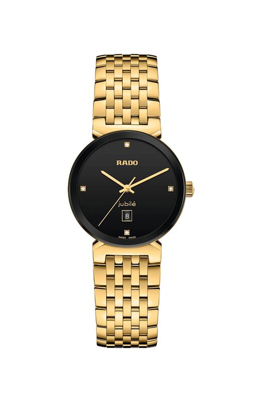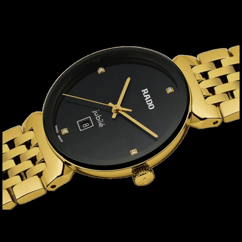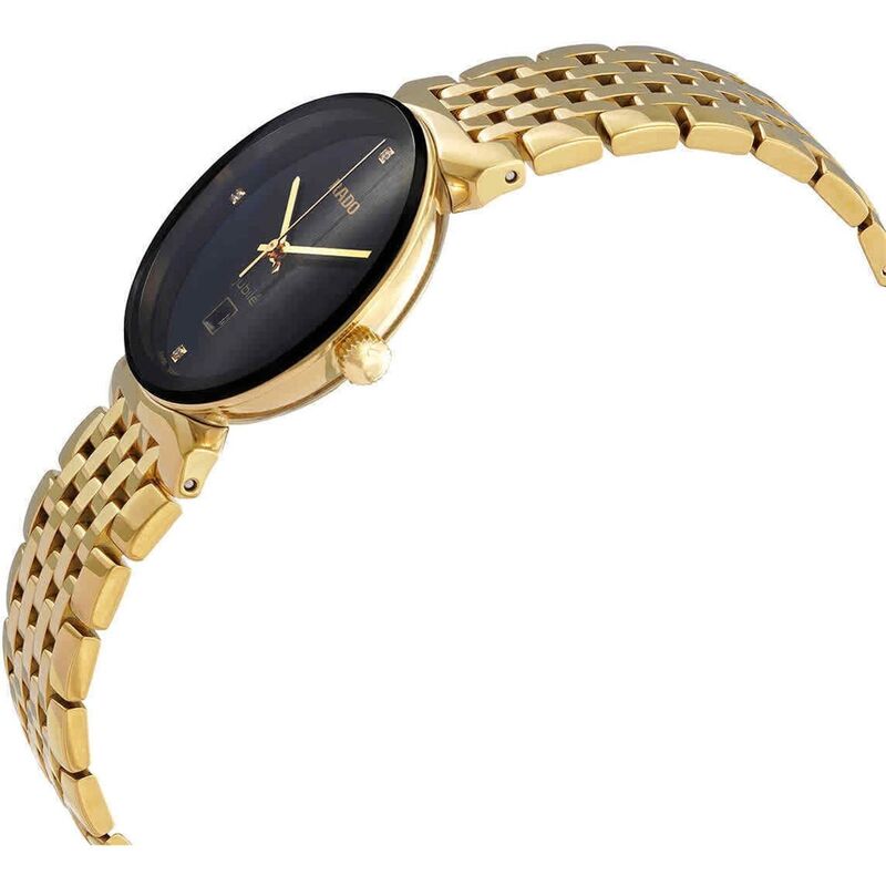 R-39154070 שעון ראדו יבואן רישמי דגם מסדרת פלורנס החדשה לאישה | שעון זהב בלוח שחור משובץ 4 יהלומים | 5 שנים אחריות | Florence Quartz Diamond Black Dial Ladies Watch R48915703 by Rado