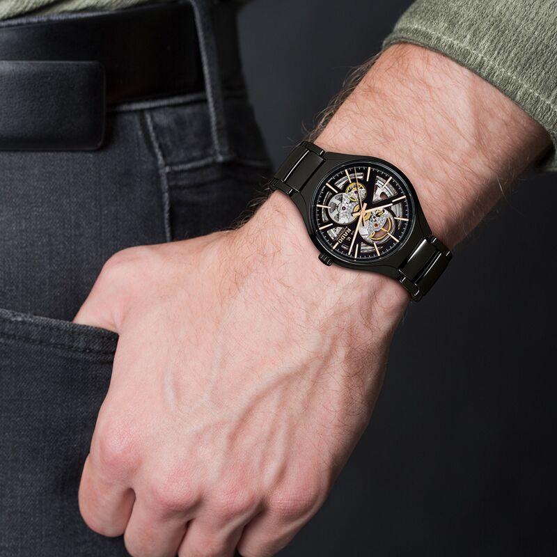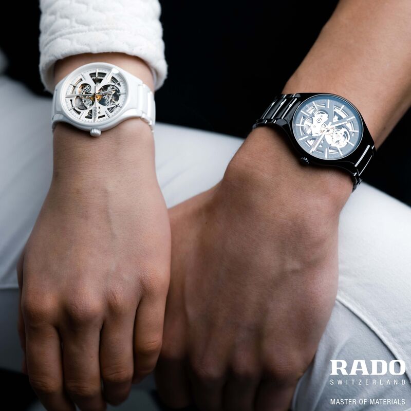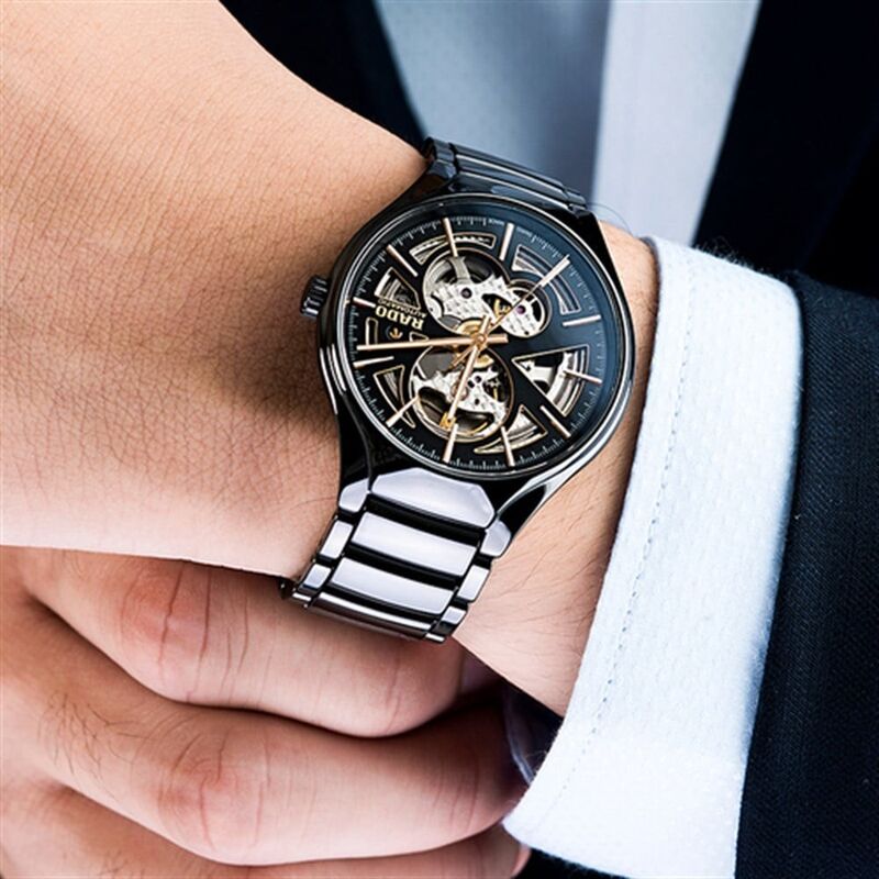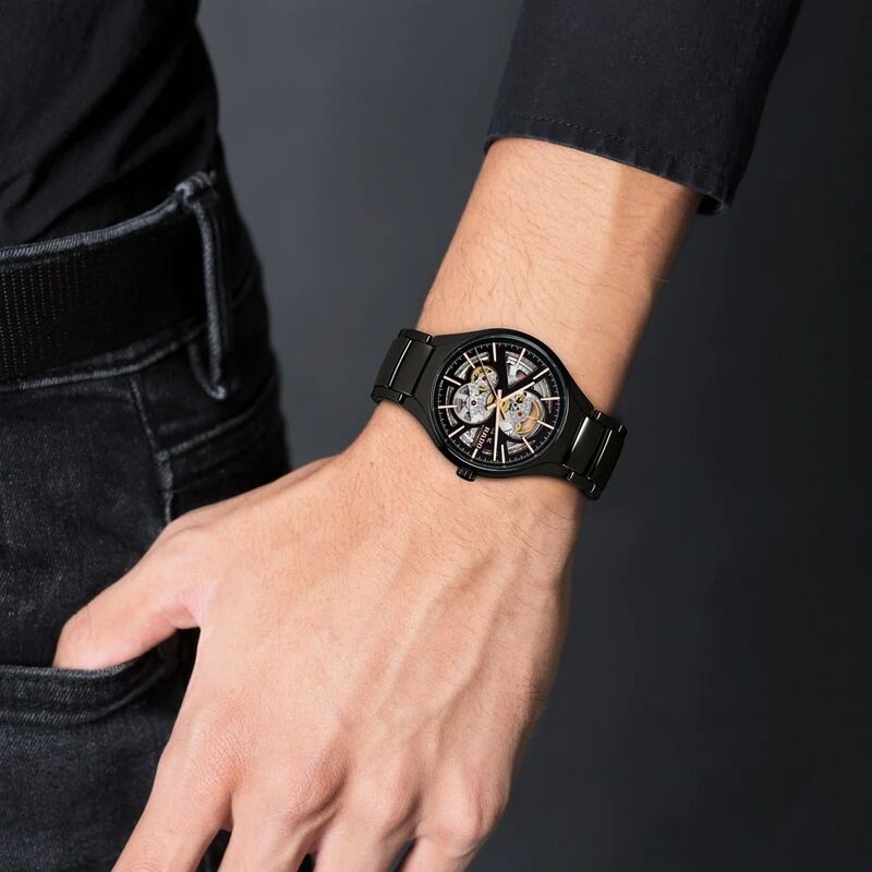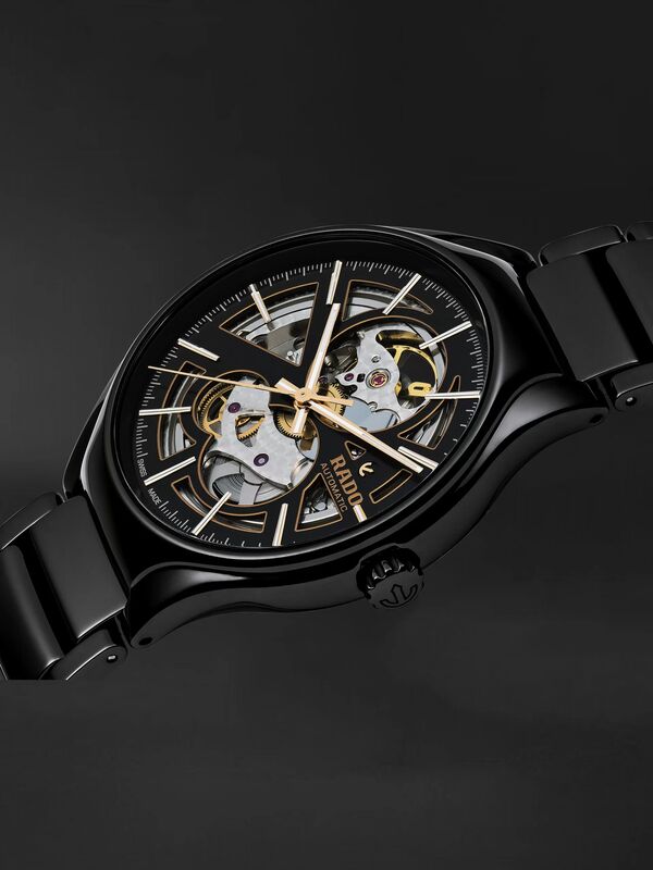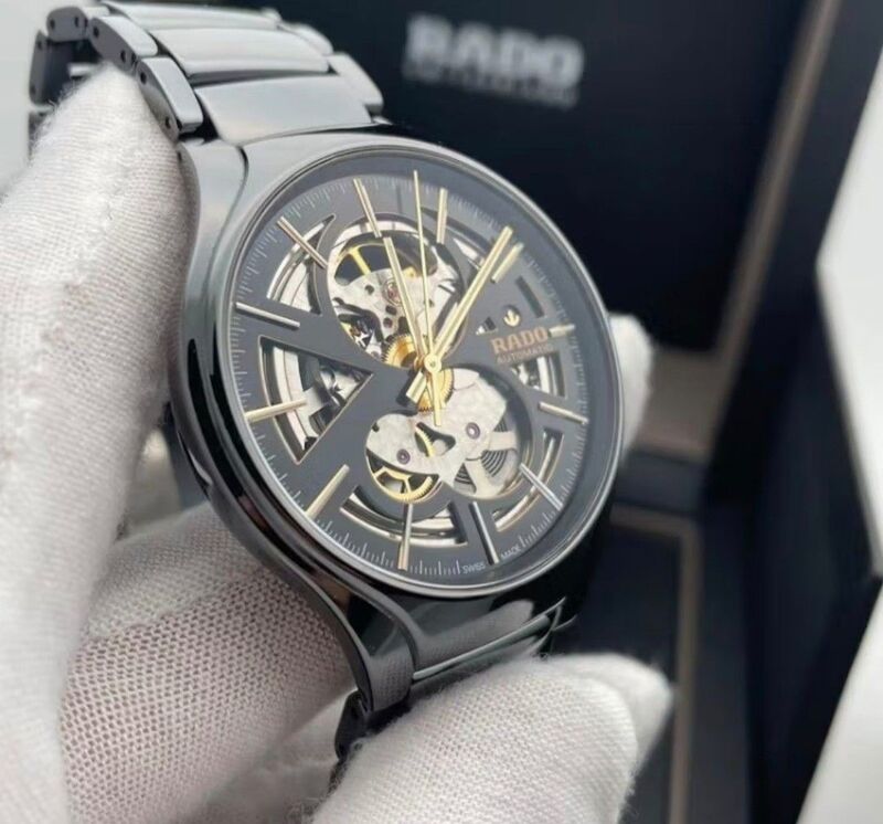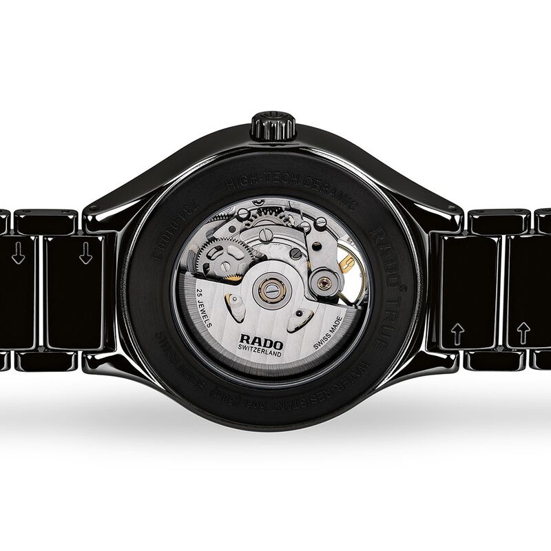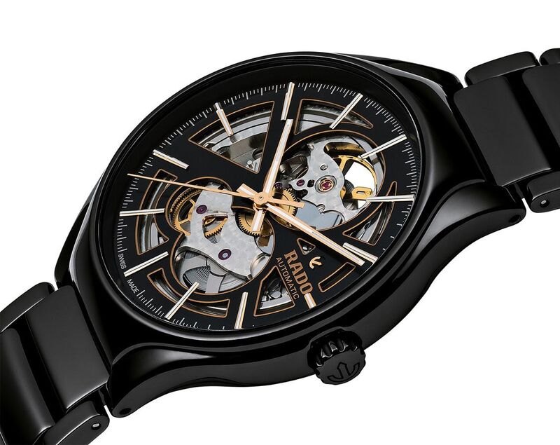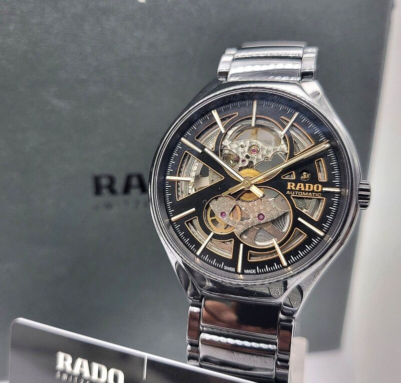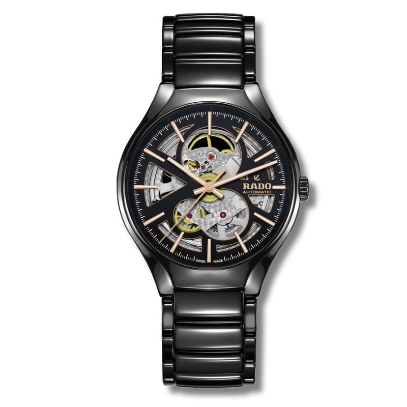 R-61073016 שעון ראדו יבואן רישמי דגם קרמי סקלטון אוטומטי לגברים | מחוגים בזהב | שעון יוקרה עם 5 שנים אחריות | Rado True Automatic Open Heart R27100162, men Watch Model