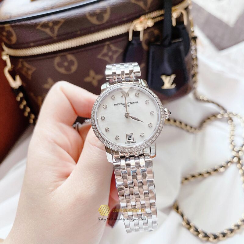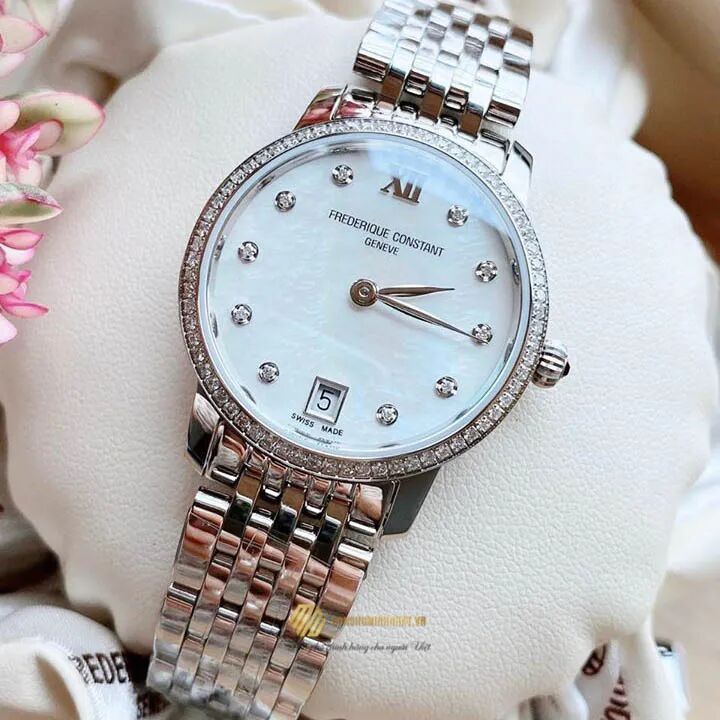 FC-220MPWD1SD26B שעון יוקרה של פרדריק קונסטנט דגם משובץ 76 יהלומים בלוח פנינה | כתר ספיר מיוחד | שנתיים אחריות | מלאי מוגבל | Frederique Constant Classics Slimline Women's Quartz Watch FC-220MPWD1SD2
