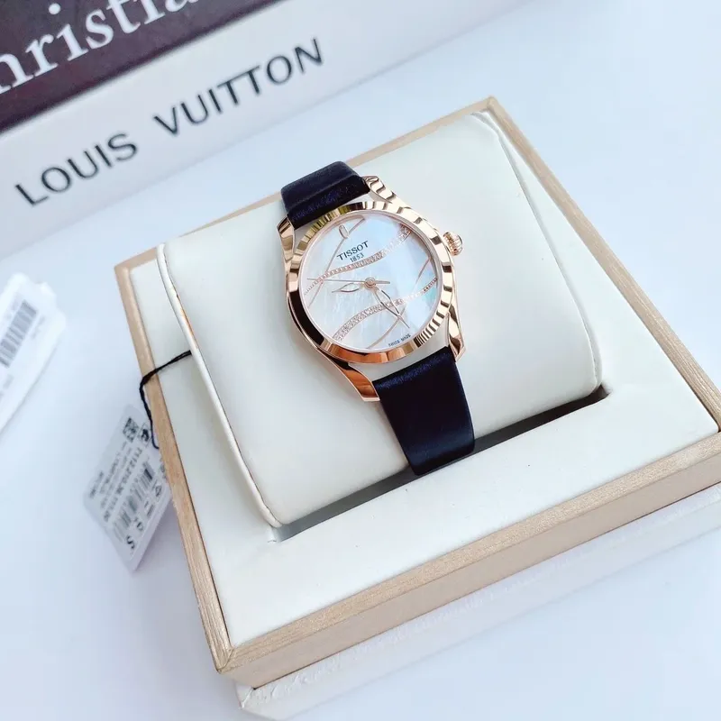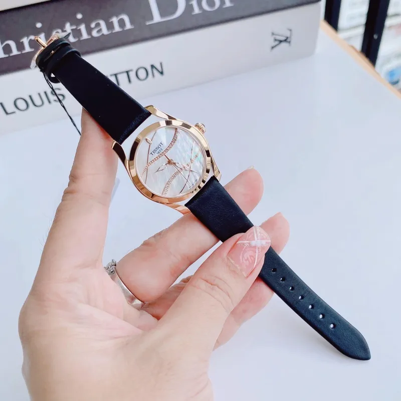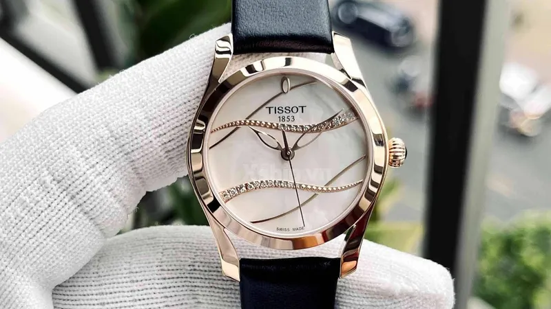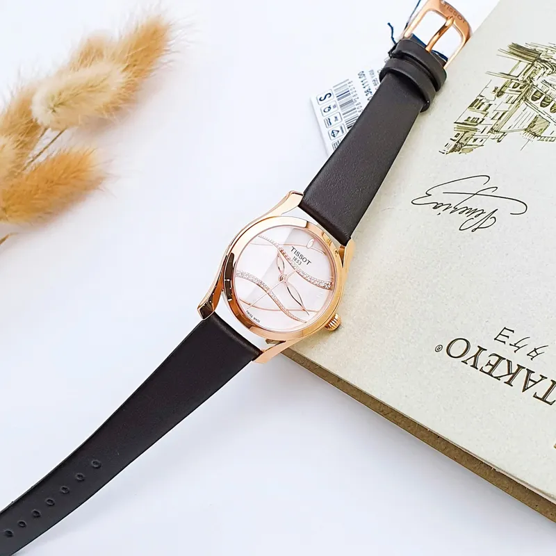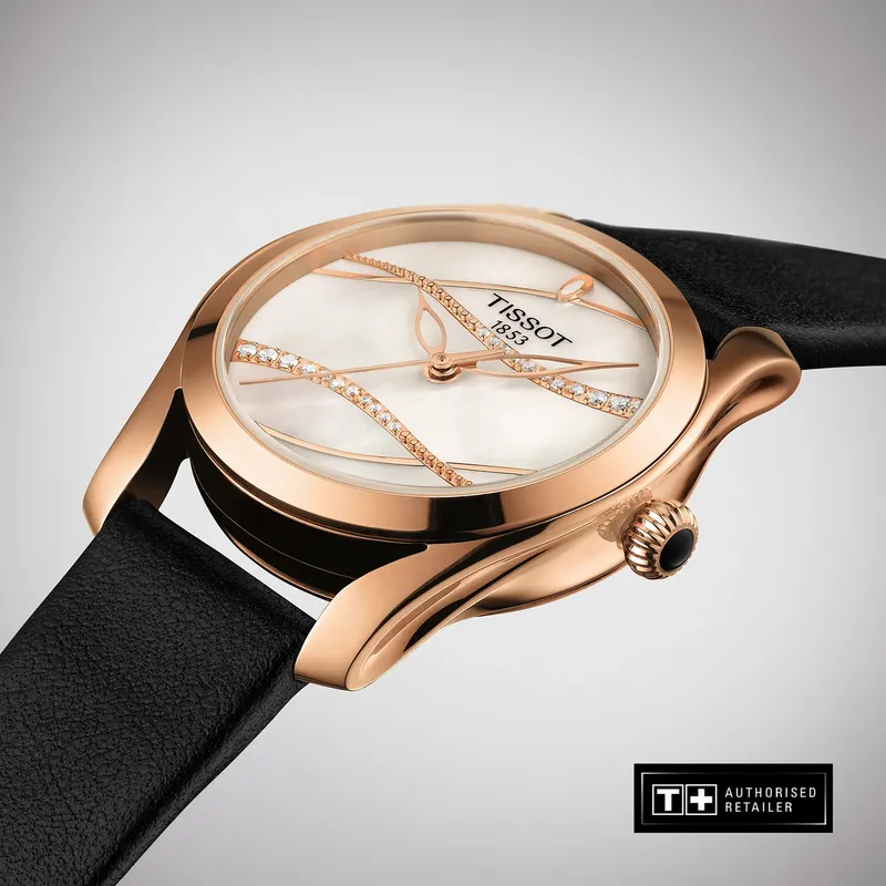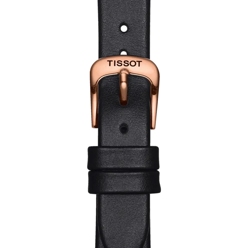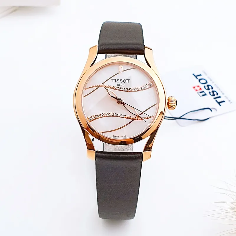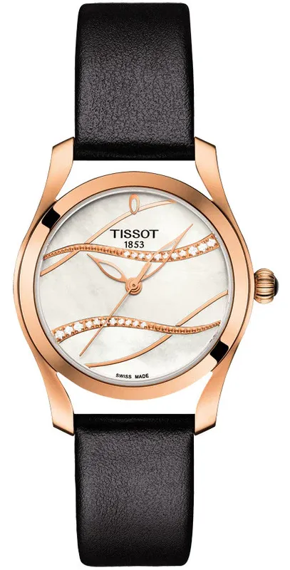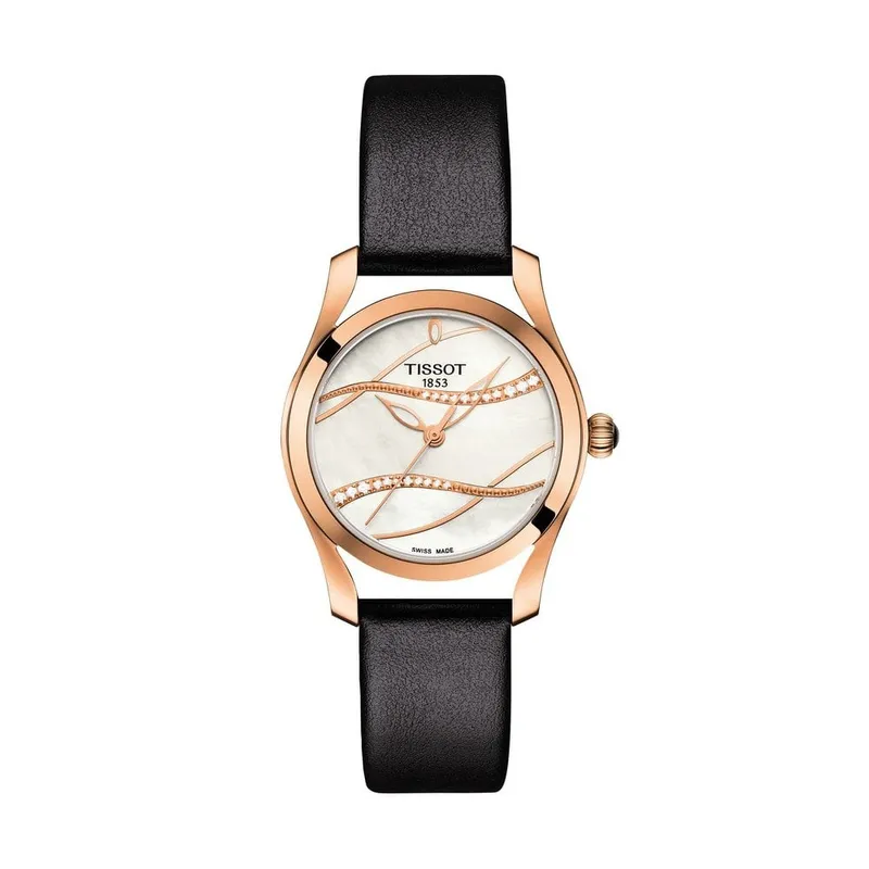 T112.210.36.111.00 שעון טיסו מיוחד לאישה בלוח פנינה גלים משובץ 22 יהלומים | רוז גולד ברצועת עור שנתיים אחריות | מלאי מוגבל | Tissot T-Wave White Mother of Pearl Diamond Dial T1122103611100