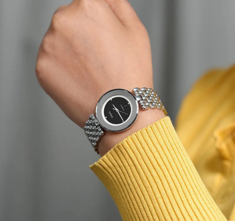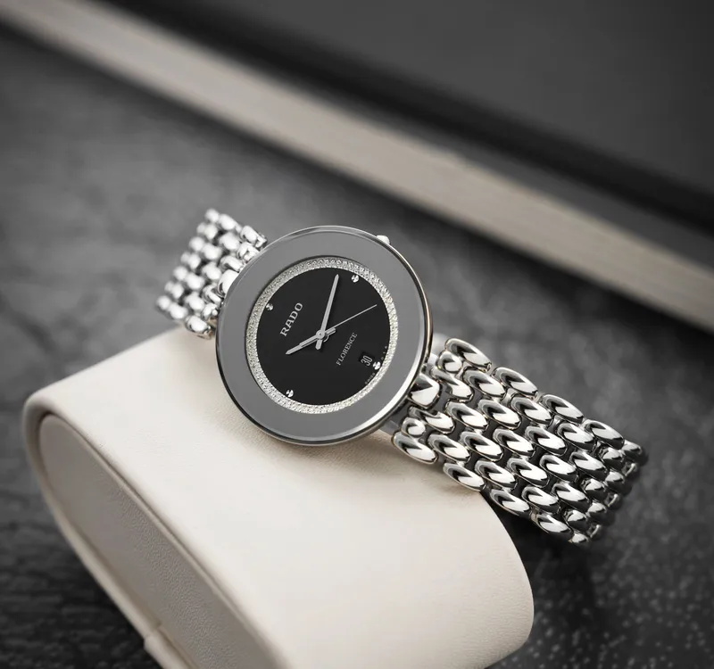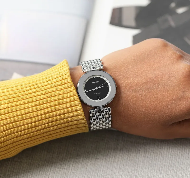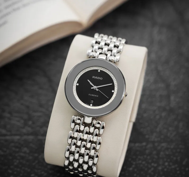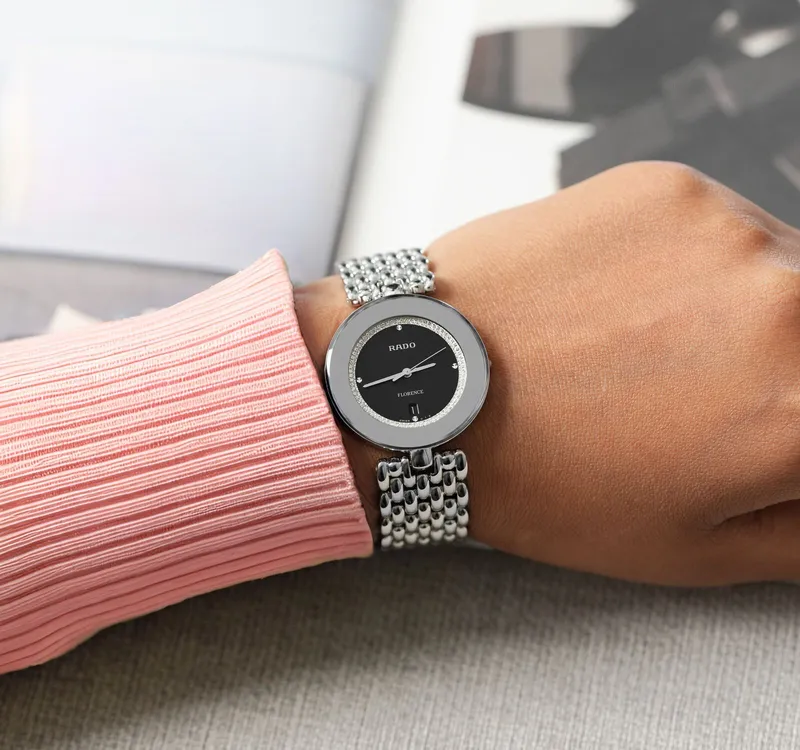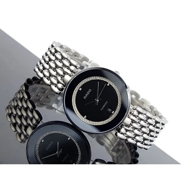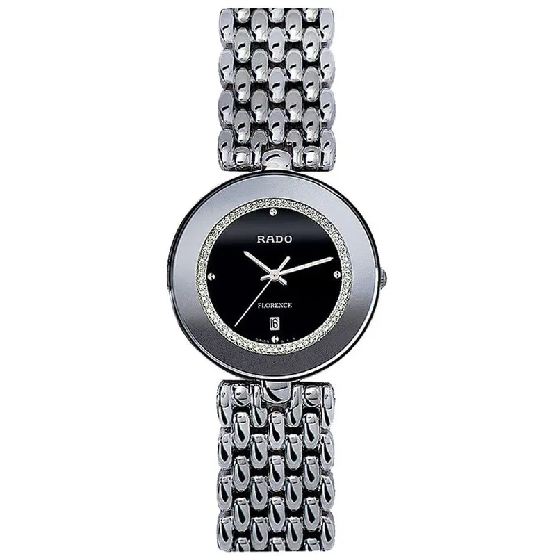 R-37424016 ראדו יבואן רישמי מסדרת פלורנס לנשים | לוח שחור נצנצים | 5 שנים אחריות | רצועת פלדת אל חלד | שעוני יוקרה שווצריים לנשים | Rado Women's R48742163 Florence Watch. Swiss made with stainless
