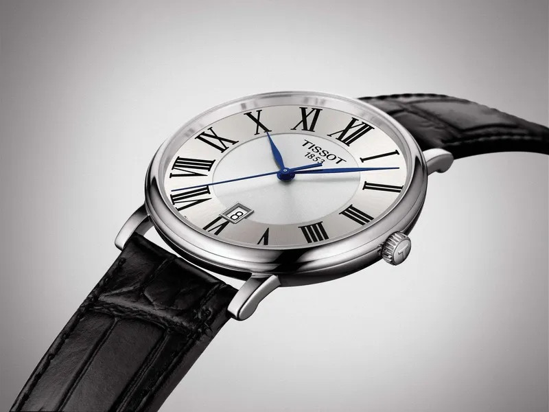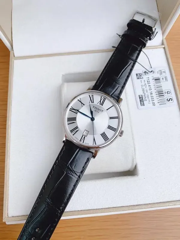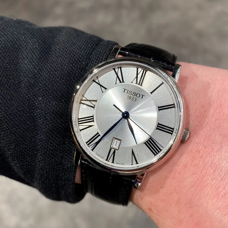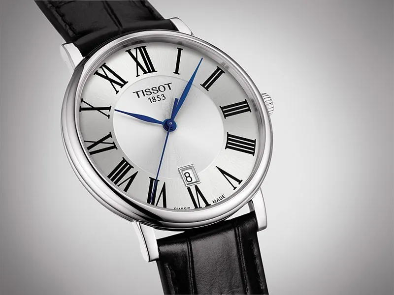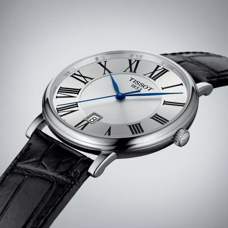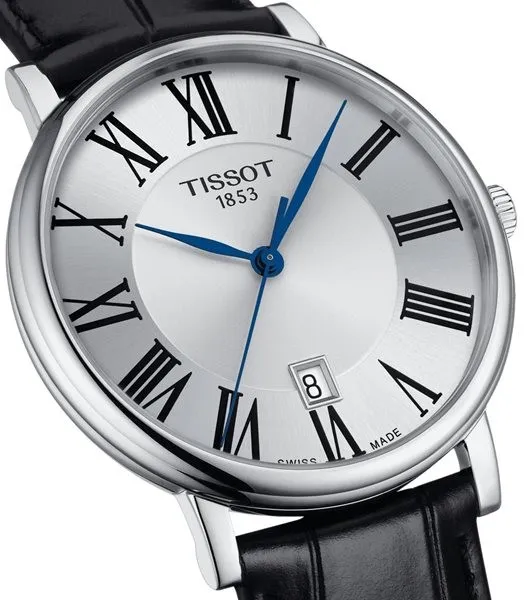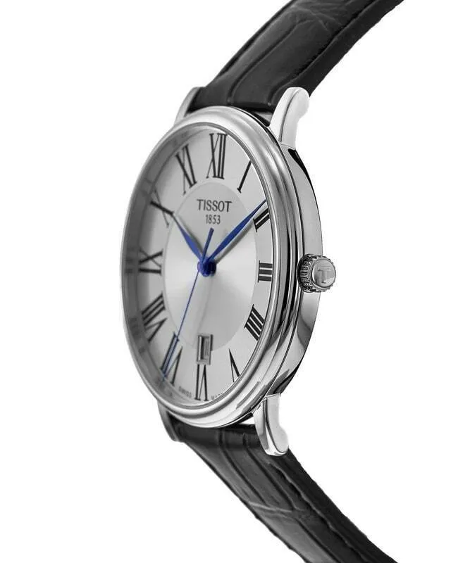 T122.410.16.033.00 שעון טיסו מושלם לגברים | דגם אלגנטי בלוח רומי כולל תאריכון ומחוגים כחולים |3 שנים אחריות | Tissot Carson Premium Quartz Black Leather 40mm Watch T1224101603300