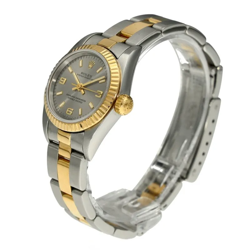 76193 שעון רולקס לאישה 26 מ''מ בלוח אפור נדיר ומיוחד | באזל ורצועת זהב 18K | שעון יד 2 שמור מאד כולל שנה אחריות | Rolex Oyster Perpetual Steel Yellow Gold Ladies Watch 76193