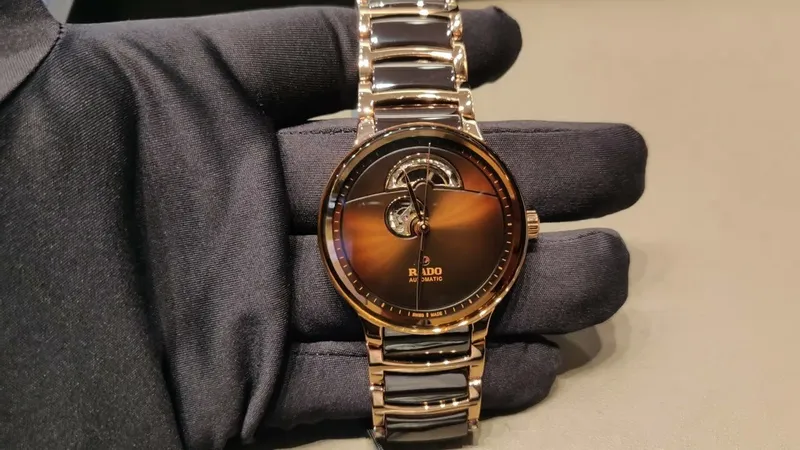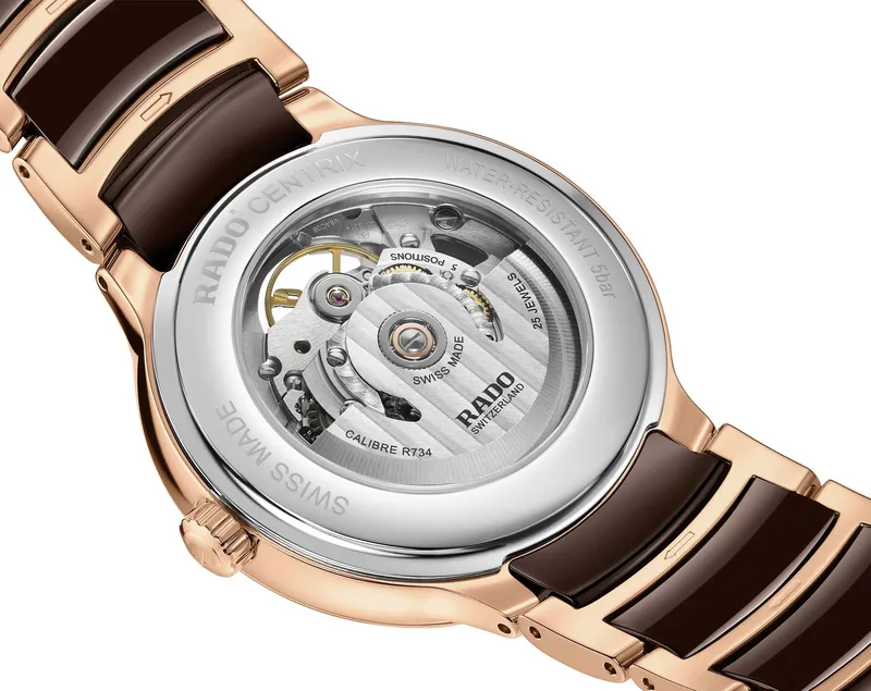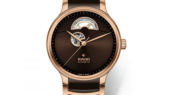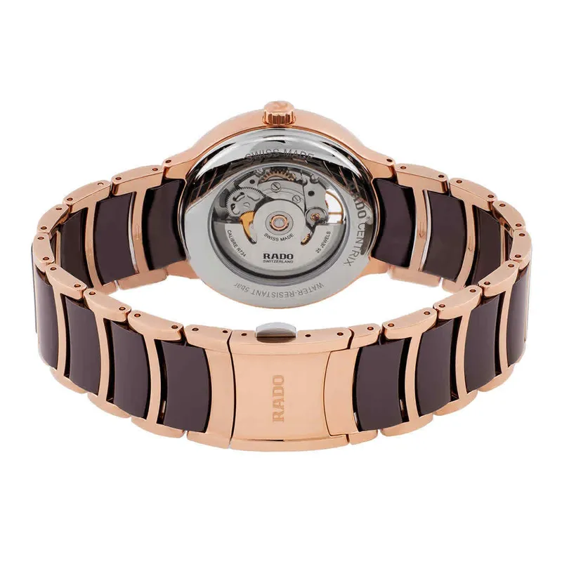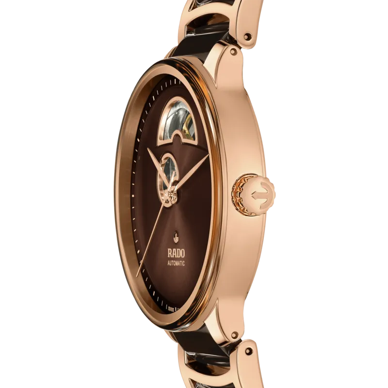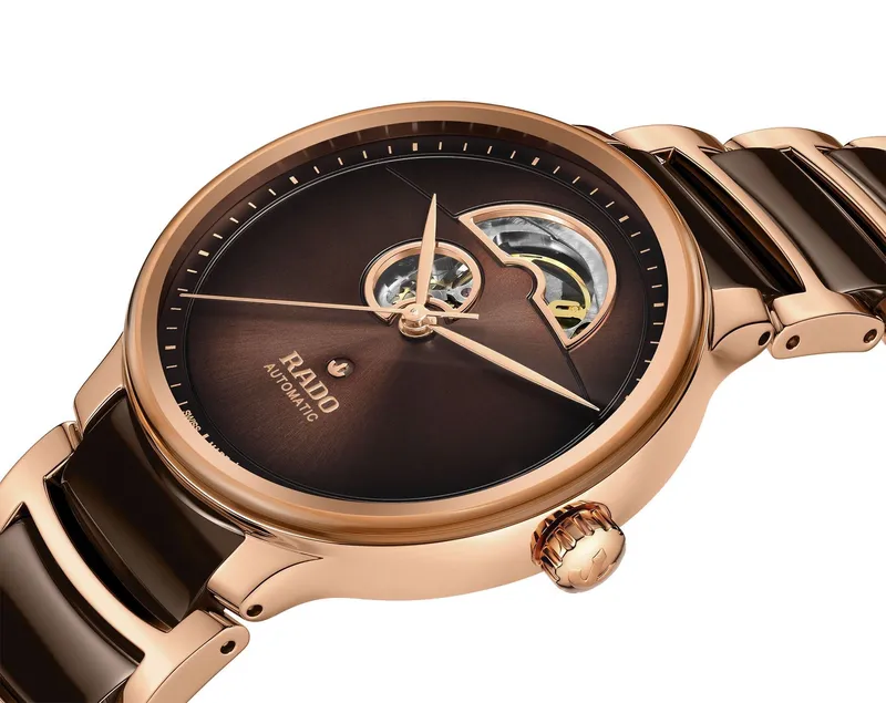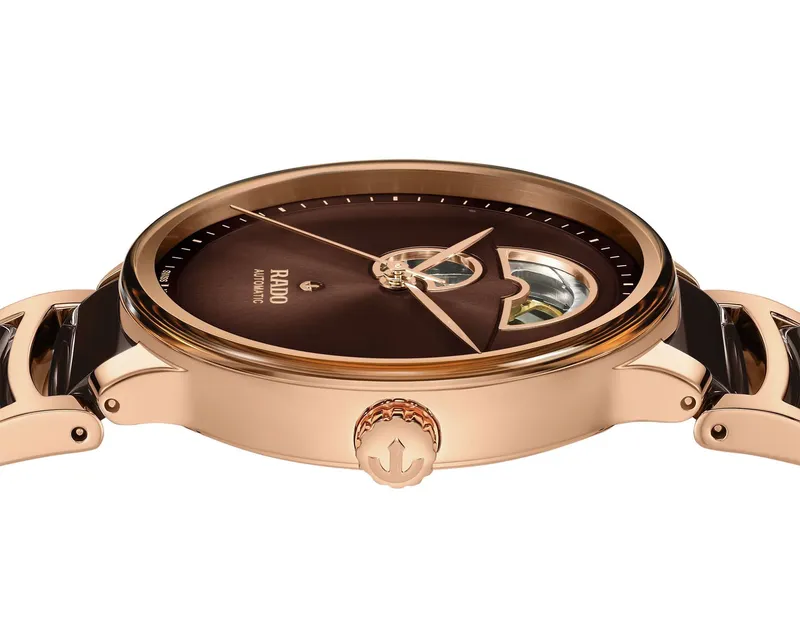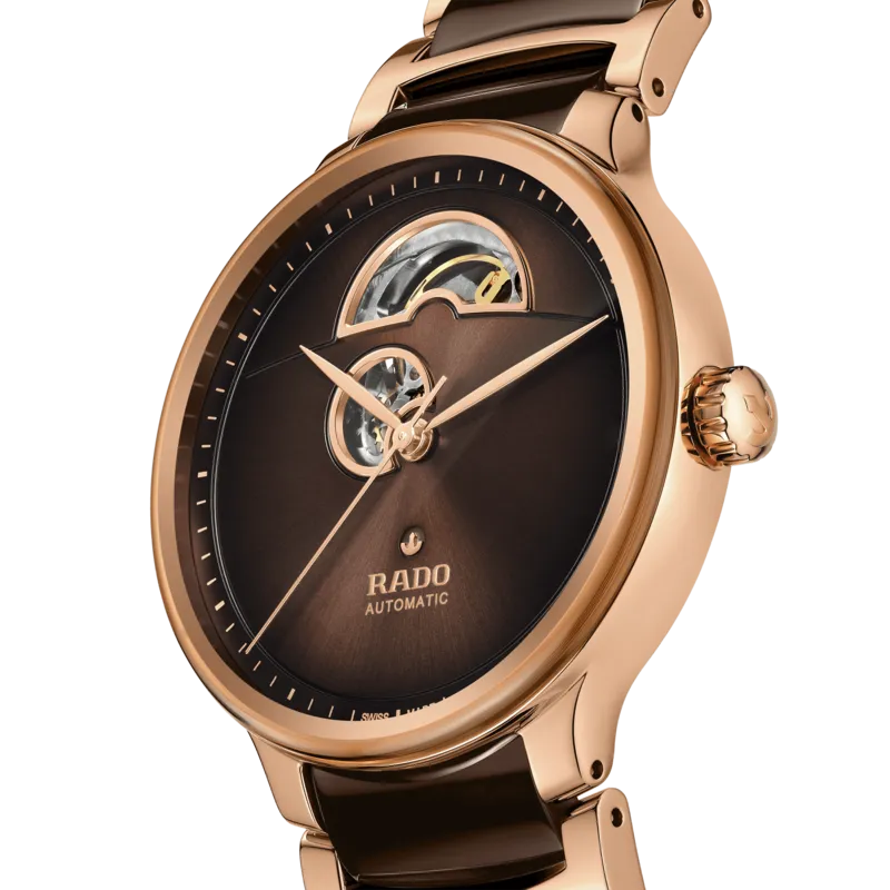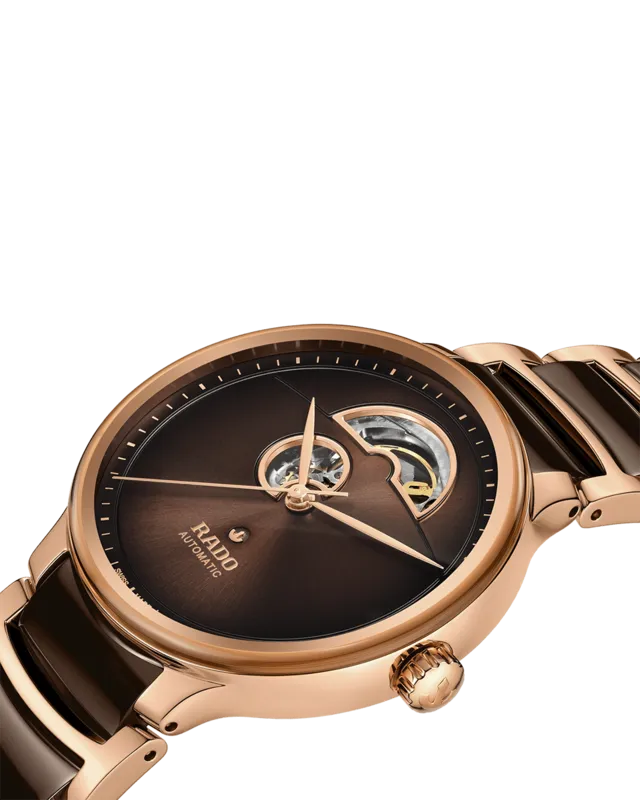 R-60133030 שעון ראדו יבואן רישמי פלאנט | מסדרת סנטריקס החדשה לגברים רוז גולד משולב קרמיקה חומה | מנגנון אוטומטי בלוח חום | 5 שנים אחריות | Rado Centrix Automatic Open Heart Brown Dial Watch R30013302