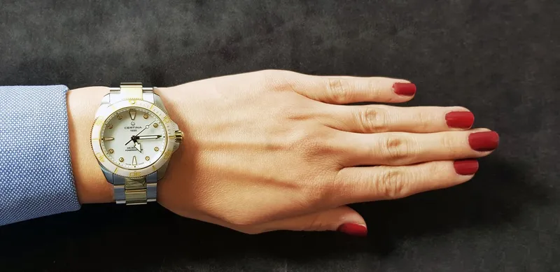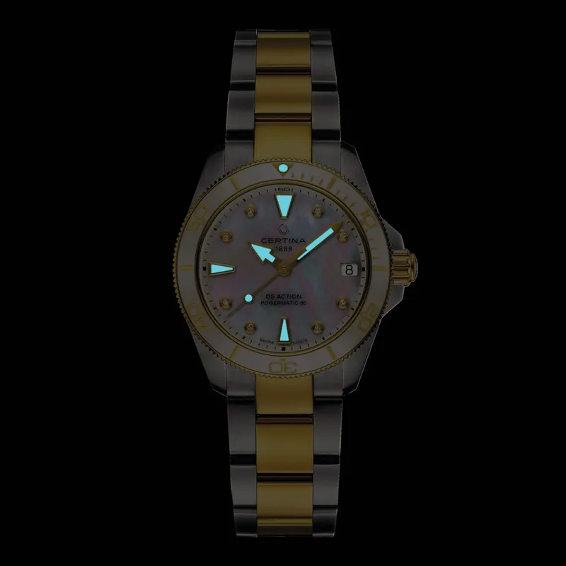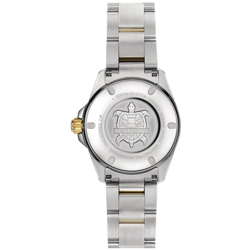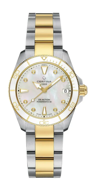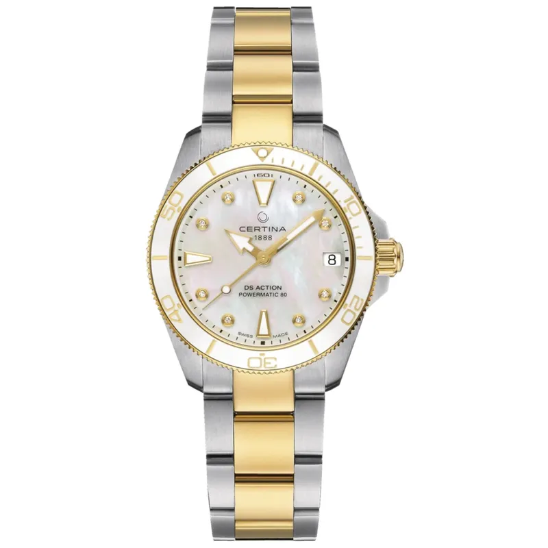 C032.007.22.116.00 שעון יוקרתי לנשים של סרטינה מהסדרה החדשה | רצועה משולבת לוח פנינה משובץ 8 יהלומים מנגנון אוטומטי עם 5 שנים אחריות |Certina DS Action Lady Ladies Watch Mother Of Pearl C032007221160