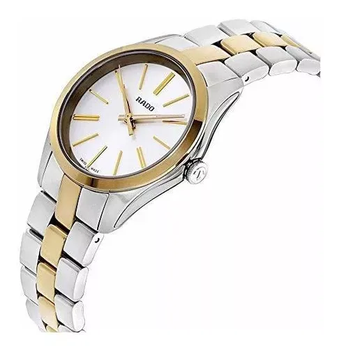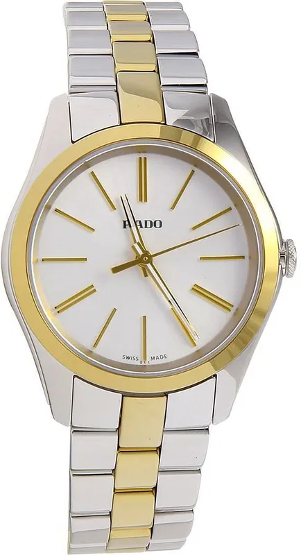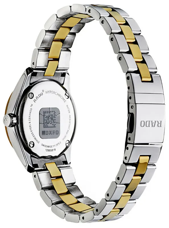 R32975112 שעון ראדו לנשים מסדרת הייפרכרום | רצועה משולבת זהב קרמי | לוח פסים כסוף כולל תאריכון | שנתיים אחריות | מלאי מוגבל |Rado HyperChrome Steel and Ceramic Women's Watch R32975112