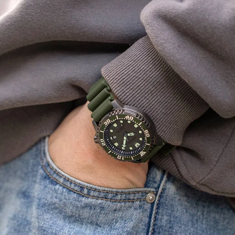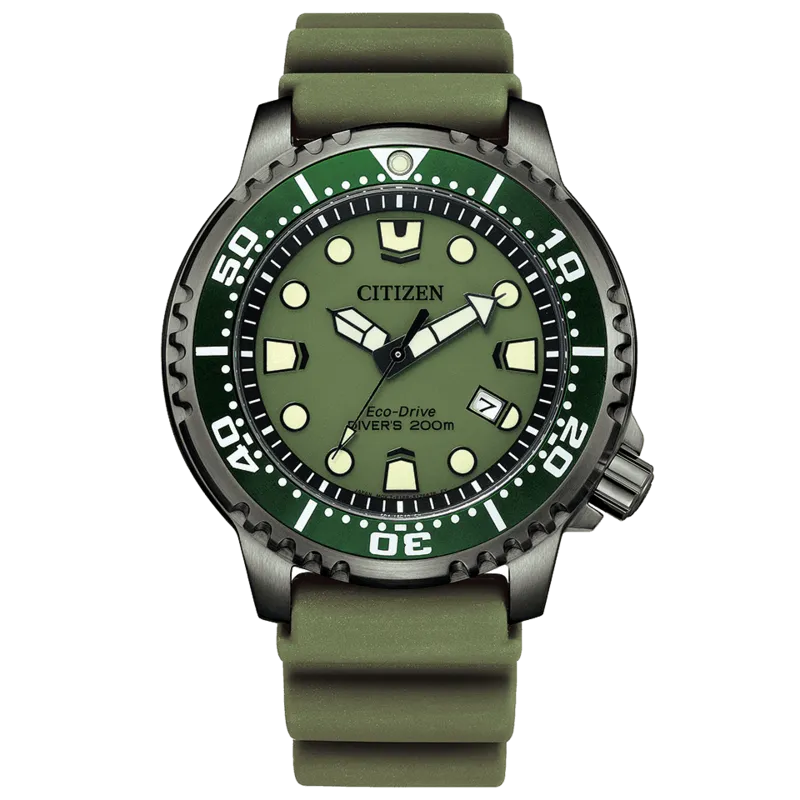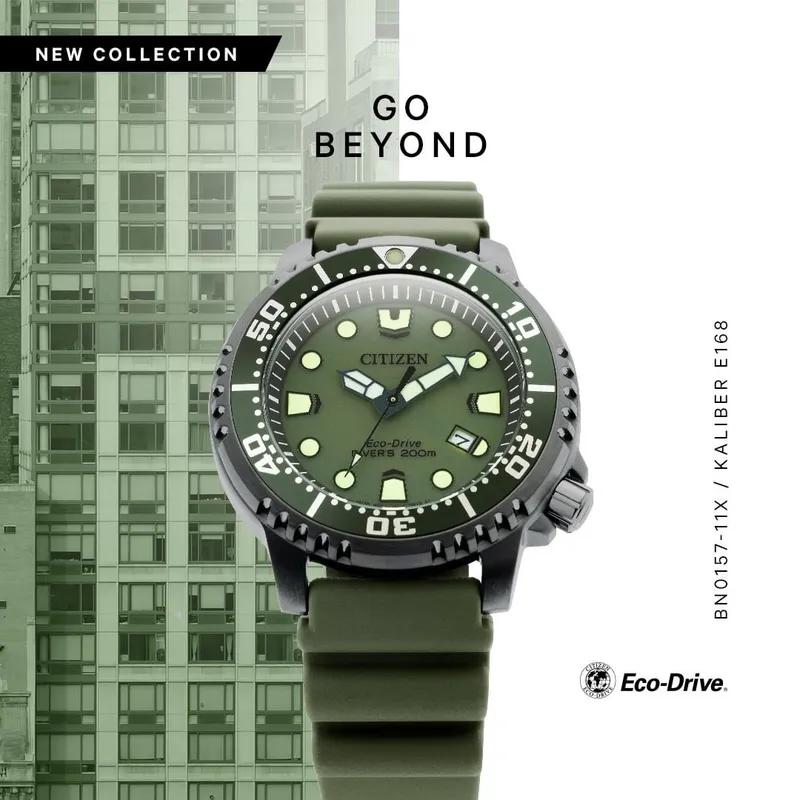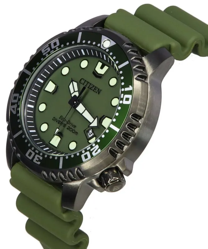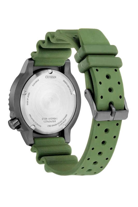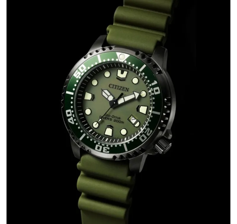 BN0157-11X שעון סיטיזן פרומאסטר צלילה לגברים | שעון מושחר בלוח ורצועה ירוקים | מחוגים זוהרים | מנגנון סולארי | Citizen Promaster collection Eco-Drive Solar Power movement 200m Divers watch BN0157-11X