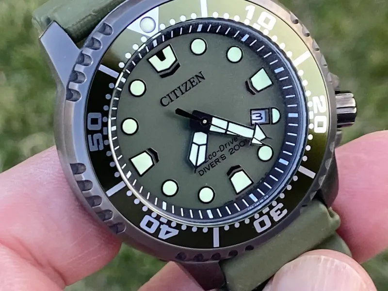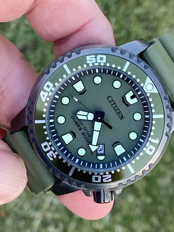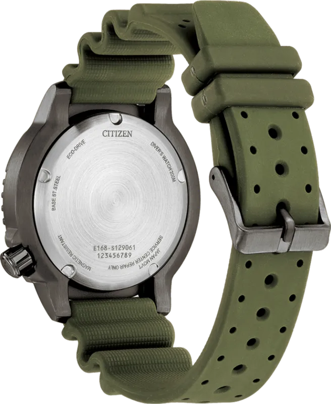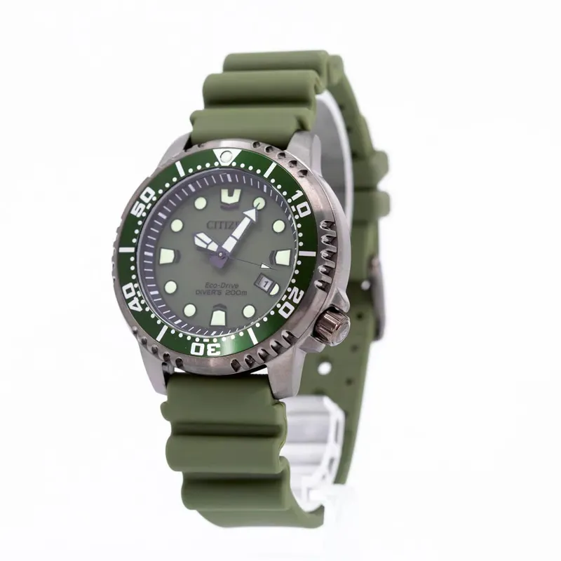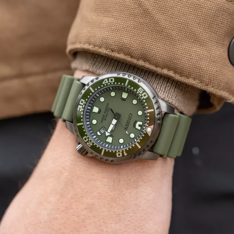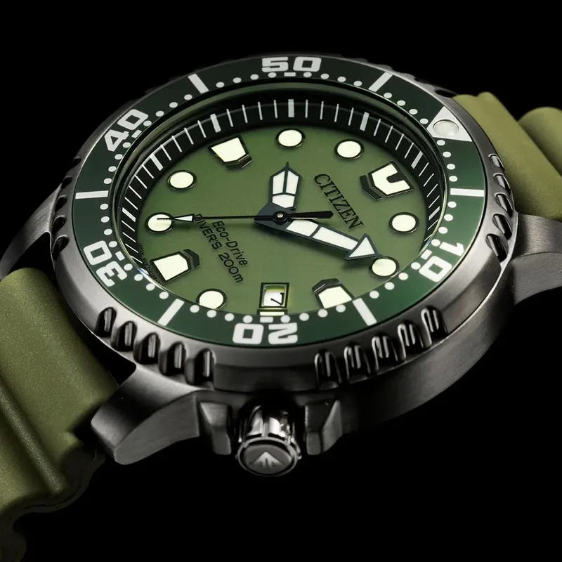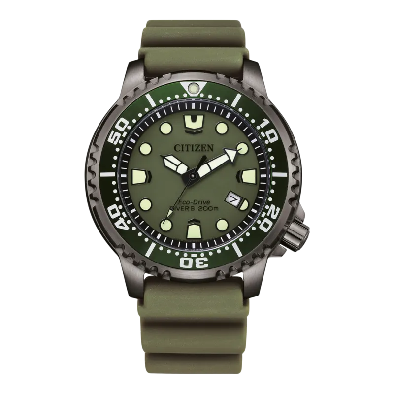 BN0157-11X שעון סיטיזן פרומאסטר צלילה לגברים | שעון מושחר בלוח ורצועה ירוקים | מחוגים זוהרים | מנגנון סולארי | Citizen Promaster collection Eco-Drive Solar Power movement 200m Divers watch BN0157-11X