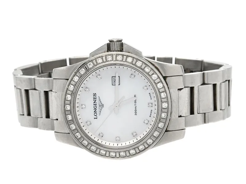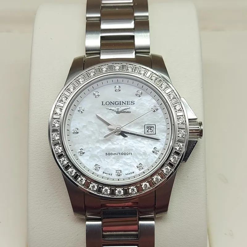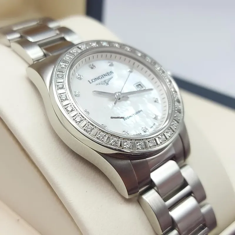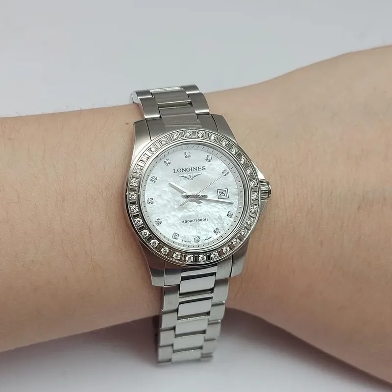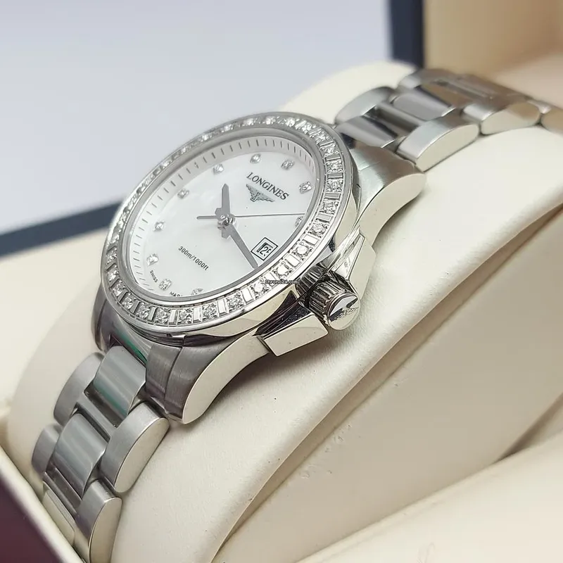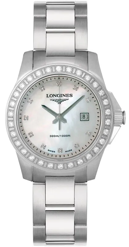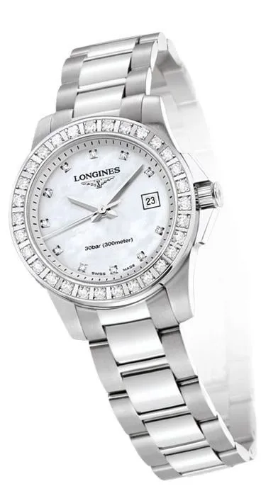 L3.258.0.89.6 שעון יד לונג'ין יוקרתי לנשים | דגם יד שנייה משובץ 41 יהלומים בלוח פנינה | כולל קופסא ותעודות | שנה אחריות | LONGINES Conquest Mother-Of-Pearl Diamond Quartz Ladies Watch L32580896