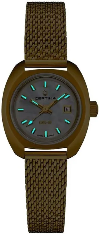 C024.207.33.111.00 שעון סרטינה לנשים מסדרת די אס 2 החדשה | דגם זהב ברצועת רשת לוח פנינה לבן | מנגנון אוטומטי גב שקוף | 5 שנים אחריות יבואן רשמי | Certina Damenuhr DS-2 Lady C0242073311100