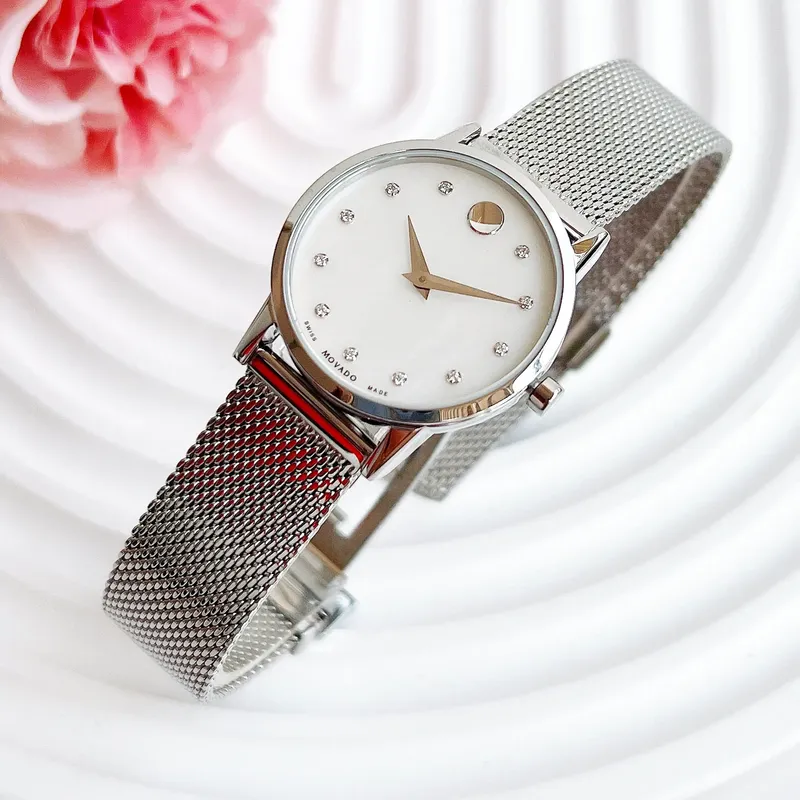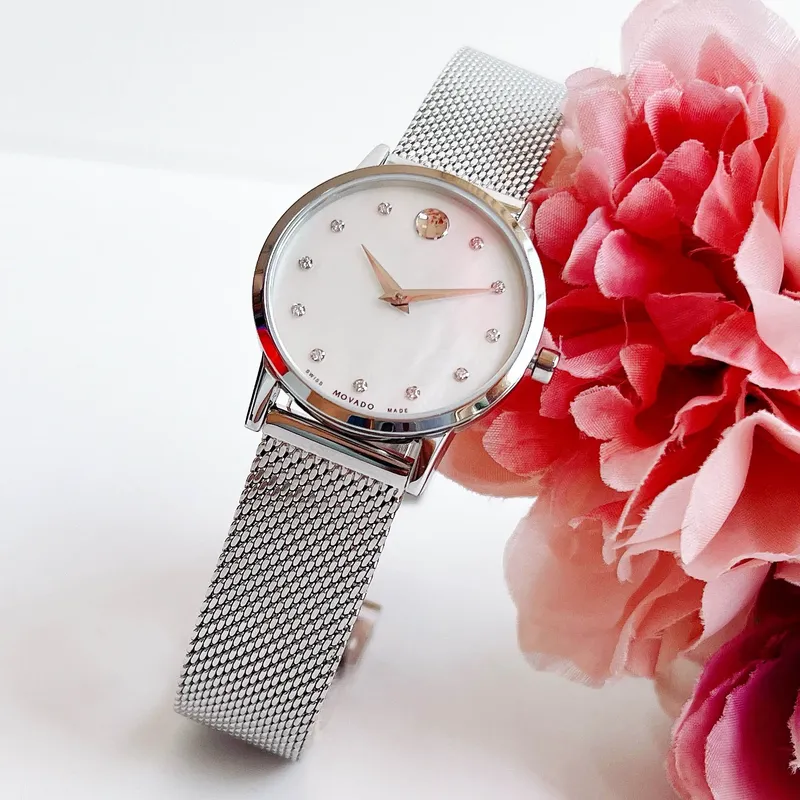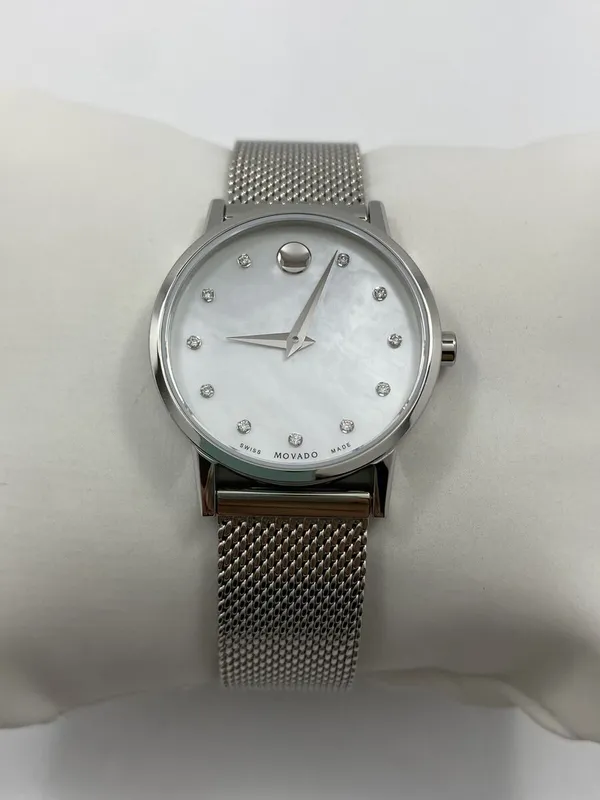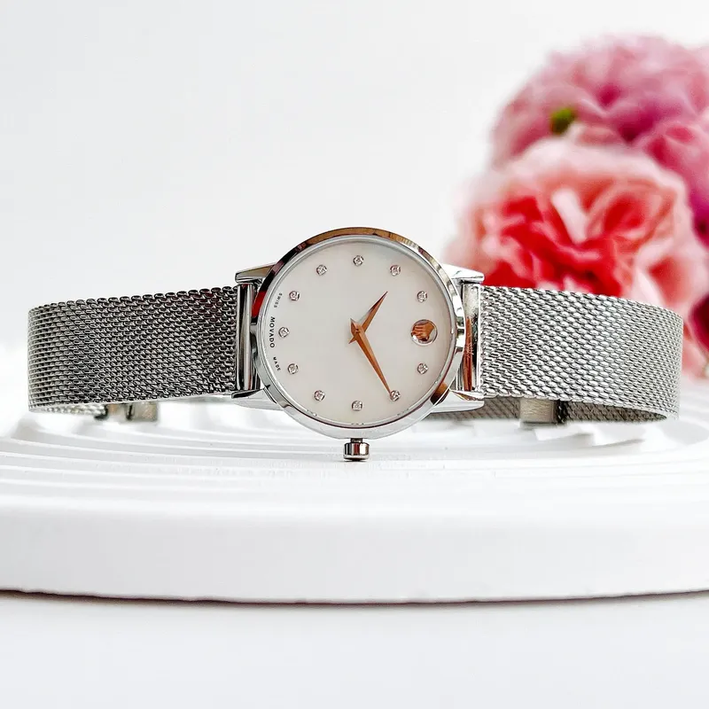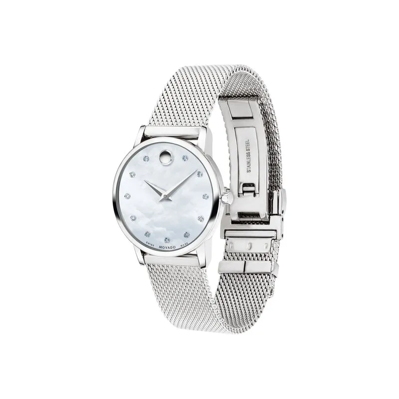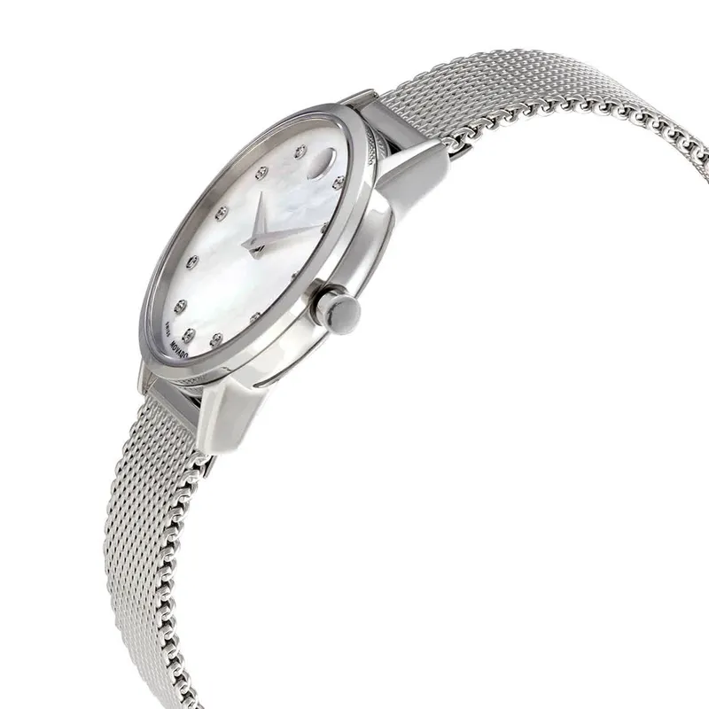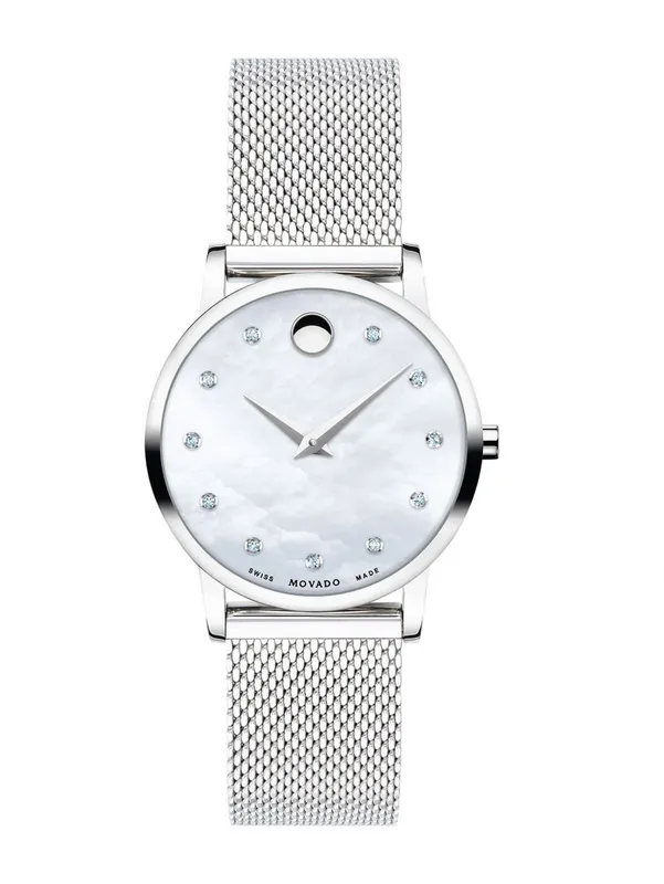 0607491 שעון יד יוקרתי לנשים של מובאדו שוויץ | דגם בלוח פנינה משובץ 11 יהלומים | רצועת רשת אופנתית ומיוחדת | מלאי מוגבל | שנתיים אחריות יבואן רשמי |Museum Classic Mother of Pearl Diamond Dial Steel Wo