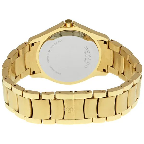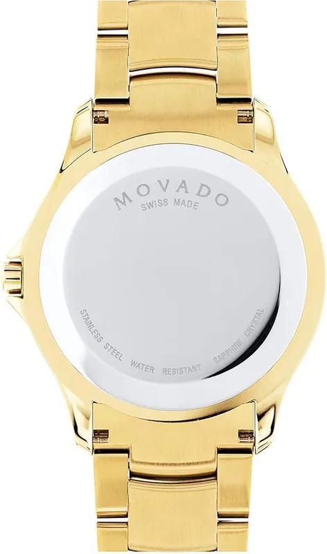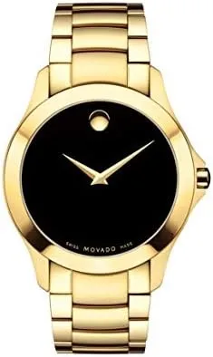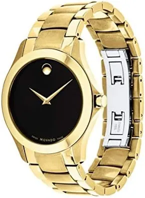 0607034 שעון יד של מובאדו לגברים דגם זהב בלוח שחור נקי קלאסי ואלגנטי | רצועת פלדת אל חלד | שעון דק מאד כולל שנתיים אחריות יבואן רשמי | MOVADO 0607034 Masino Black Dial Yellow Gold PVD