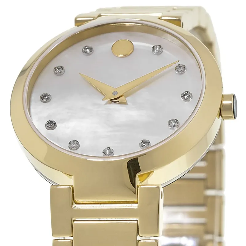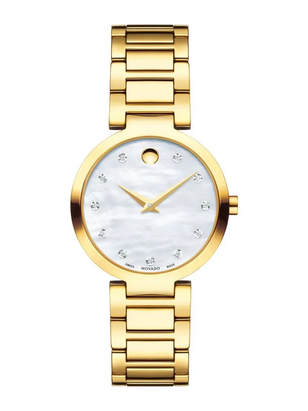 0607105 שעון יוקרה לאישה של מובאדו שוויץ | דגם זהב בלוח פנינה משובץ 11 יהלומים | אחריות יבואן רשמי לשנתיים | מלאי מוגבל | Movado Women's Modern Classic Watch 28mm 0607105